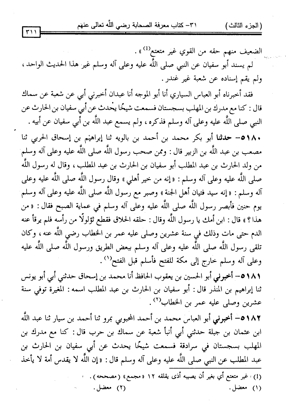 5180 - حَدَّثَنِي أَبُو بَكْرٍ مُحَمَّدُ بْنُ أَحْمَدَ بْنِ بَالَوَيْهِ ، ثنا إِبْرَاهِيمُ بْنُ إِسْحَاقَ الْحَرْبِيُّ ، ثنا مُصْعَبُ بْنُ عَبْدِ اللَّهِ بْنِ الزُّبَيْرِ ، قَالَ: وَمِمَّنْ صَحِبَ رَسُولَ اللَّهِ صَلَّى اللَّهُ عَلَيْهِ وَسَلَّمَ مِنْ وَلَدِ الْحَارِثِ بْنِ عَبْدِ الْمُطَّلِبِ أَبُو سُفْيَانَ بْنُ الْحَارِثِ بْنِ عَبْدِ الْمُطَّلِبِ ، وَقَالَ لَهُ رَسُولُ اللَّهِ صَلَّى اللَّهُ عَلَيْهِ وَسَلَّمَ: " إِنَّهُ مِنْ خَيْرِ أَهْلِي " ، وَقَالَ رَسُولُ اللَّهِ صَلَّى اللَّهُ عَلَيْهِ وَسَلَّمَ: " إِنَّهُ سَيِّدُ فَتَيَانِ أَهْلِ الْجَنَّةِ " ، وَصَبَرَ مَعَ رَسُولِ اللَّهِ صَلَّى اللَّهُ عَلَيْهِ وَسَلَّمَ يَوْمَ حُنَيْنٍ ، فَأَبْصَرَهُ رَسُولُ اللَّهِ صَلَّى اللَّهُ عَلَيْهِ وَسَلَّمَ فِي عَمَايَةِ الصُّبْحِ ، فَقَالَ: " مَنْ هَذَا ؟ " قَالَ: ابْنُ أُمِّكِ يَا رَسُولَ اللَّهِ ، وَقَالَ: " حَلَقَهُ الْحَلَّاقُ فَقَطَعَ ثُؤْلُولًا مِنْ رَأْسِهِ فَلَمْ يَرْقَأْ عَنْهُ الدَّمُ حَتَّى مَاتَ ، وَذَلِكَ فِي سَنَةِ عِشْرِينَ ، وَصَلَّى عَلَيْهِ عُمَرُ بْنُ الْخَطَّابِ رَضِيَ اللَّهُ عَنْهُ ، وَكَانَ تَلَقَّى رَسُولَ اللَّهِ صَلَّى اللَّهُ عَلَيْهِ وَسَلَّمَ بِبَعْضِ الطَّرِيقِ وَرَسُولُ اللَّهِ صَلَّى اللَّهُ عَلَيْهِ وَسَلَّمَ خَارِجٌ إِلَى مَكَّةَ لِلْفَتْحِ فَأَسْلَمَ قَبْلَ الْفَتْحِ "
