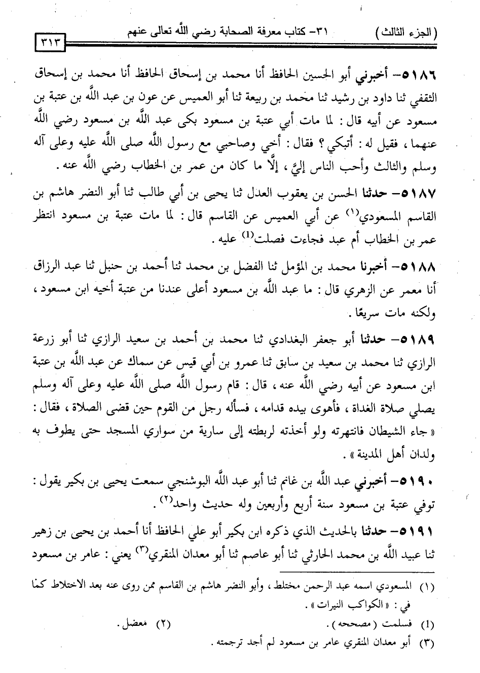 5188 - أَخْبَرَنَا مُحَمَّدُ بْنُ الْمُؤَمَّلٍ ، ثنا الْفَضْلُ بْنُ مُحَمَّدٍ ، ثنا أَحْمَدُ بْنُ حَنْبَلٍ ، ثنا عَبْدُ الرَّزَّاقِ ، أَنَا مَعْمَرٌ ، عَنِ الزُّهْرِيِّ قَالَ: " مَا عَبْدُ اللَّهِ بْنُ مَسْعُودٍ أَعْلَى عِنْدَنَا مِنْ عُتْبَةَ أَخِيهِ بْنِ مَسْعُودٍ وَلَكِنَّهُ مَاتَ سَرِيعًا "