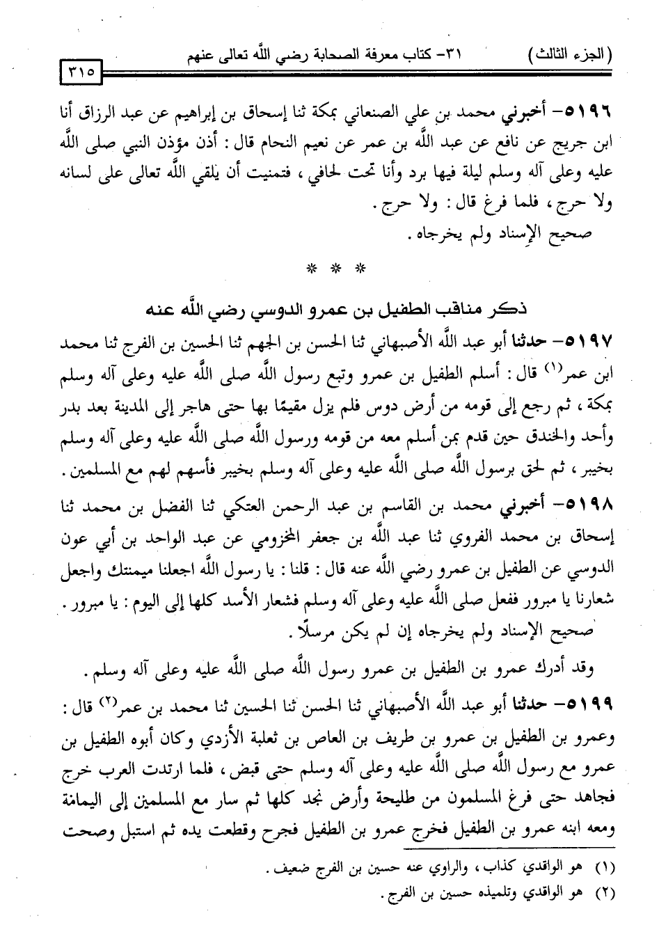 5199 - حَدَّثَنَا أَبُو عَبْدِ اللَّهِ الْأَصْبَهَانِيُّ ، ثنا الْحَسَنُ ، ثنا الْحُسَيْنُ ، ثنا مُحَمَّدُ بْنُ عُمَرَ قَالَ: " وَعَمْرُو بْنُ الطُّفَيْلِ بْنِ عَمْرِو بْنِ طَرِيفِ بْنِ الْعَاصِ بْنِ ثَعْلَبَةَ الْأَزْدِيُّ وَكَانَ أَبُوهُ الطُّفَيْلَ بْنَ عَمْرٍو مَعَ رَسُولِ اللَّهِ صَلَّى اللَّهُ عَلَيْهِ وَسَلَّمَ حَتَّى قُبِضَ ، فَلَمَّا ارْتَدَّتِ الْعَرَبُ خَرَجَ فَجَاهَدَ حَتَّى فَرَغَ الْمُسْلِمُونَ مِنْ طُلَيْحَةَ وَأَرْضِ نَجْدٍ كُلِّهَا ، ثُمَّ سَارَ مَعَ الْمُسْلِمِينَ إِلَى الْيَمَامَةَ وَمَعَهُ ابْنُهُ عَمْرُو بْنُ الطُّفَيْلِ ، فَخَرَجَ عَمْرُو بْنُ الطُّفَيْلِ فَجُرِحَ وَقُطِعَتْ يَدُهُ ، ثُمَّ اسْتَبَلَّ وَصَحَّتْ -[316]- يَدُهُ ، فَبَيْنَا هُوَ عِنْدَ عُمَرَ بْنِ الْخَطَّابِ رَضِيَ اللَّهُ عَنْهُ إِذْ أُتِيَ بِطَعَامٍ فَتَنَحَّى عَنْهُ ، فَقَالَ عُمَرُ: مَا لَكَ تَنَحَّيْتَ بِمَكَانِ يَدِكَ ؟ قَالَ: أَجَلْ ، قَالَ: لَا وَاللَّهِ ، لَا أَذُوقُهُ حَتَّى تُسَوِّطَ بِيَدِكَ فِيهِ ، فَوَاللَّهِ مَا فِي الْقَوْمِ أَحَدٌ بَعْضُهُ فِي الْجَنَّةِ غَيْرَكَ ، ثُمَّ خَرَجَ عَامَ الْيَرْمُوكِ فِي عَهْدِ عُمَرَ رَضِيَ اللَّهُ عَنْهُ مَعَ الْمُسْلِمِينَ فَقُتِلَ شَهِيدًا رَضِيَ اللَّهُ عَنْهُ "