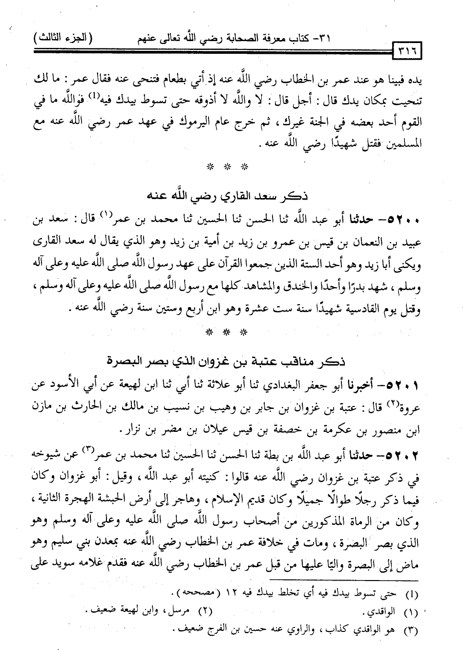 5202 - حَدَّثَنَا أَبُو عَبْدِ اللَّهِ بْنُ بُطَّةَ ، ثنا الْحَسَنُ ، ثنا الْحُسَيْنُ ، ثنا مُحَمَّدُ بْنُ عُمَرَ ، عَنْ شُيُوخِهِ فِي ذِكْرِ عُتْبَةَ بْنِ غَزْوَانَ رَضِيَ اللَّهُ عَنْهُ ، قَالُوا: " كُنْيَتُهُ أَبُو عَبْدِ اللَّهِ وَقِيلَ أَبُو غَزْوَانَ ، وَكَانَ فِيمَا ذُكِرَ رَجُلًا طُوَالًا جَمِيلًا ، وَكَانَ قَدِيمَ الْإِسْلَامِ ، وَهَاجَرَ إِلَى أَرْضِ الْحَبَشَةِ الْهِجْرَةَ الثَّانِيَةَ ، وَكَانَ مِنَ الرُّمَاةِ الْمَذْكُورِينَ مِنْ أَصْحَابِ رَسُولِ اللَّهِ صَلَّى اللَّهُ عَلَيْهِ وَسَلَّمَ ، وَهُوَ الَّذِي بَصَّرَ الْبَصْرَةَ ، وَمَاتَ فِي خِلَافَةِ عُمَرَ بْنِ الْخَطَّابِ رَضِيَ اللَّهُ عَنْهُ بِمَعْدِنِ بَنِي سُلَيْمٍ وَهُوَ مَاضٍ إِلَى الْبَصْرَةِ وَالِيًا عَلَيْهَا مِنْ قِبَلِ عُمَرَ بْنِ الْخَطَّابِ رَضِيَ اللَّهُ عَنْهُ ، فَقَدِمَ غُلَامُهُ سُوَيْدُ عَلَى -[317]- عُمَرَ بِمَتَاعِهِ وَتَرِكَتِهِ "
