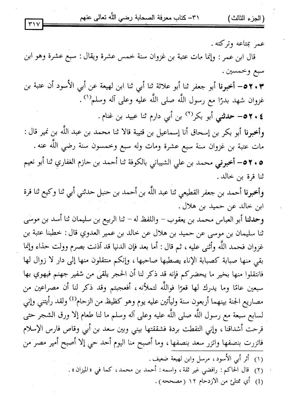 5204 - حَدَّثَنِي أَبُو بَكْرِ بْنُ أَبِي دَارِمٍ ، ثنا عُبَيْدُ بْنُ غَنَّامٍ ، وَأَخْبَرَنَا أَبُو بَكْرِ بْنُ إِسْحَاقَ ، أَنَا إِسْمَاعِيلُ بْنُ قُتَيْبَةَ ، قَالَا: ثنا مُحَمَّدُ بْنُ عَبْدِ اللَّهِ بْنِ نُمَيْرٍ قَالَ: " مَاتَ عُتْبَةُ بْنُ غَزْوَانَ سَنَةَ سَبْعَ عَشْرَةَ وَمَاتَ وَلَهُ سَبْعٌ وَخَمْسُونَ سَنَةً رَضِيَ اللَّهُ عَنْهُ "