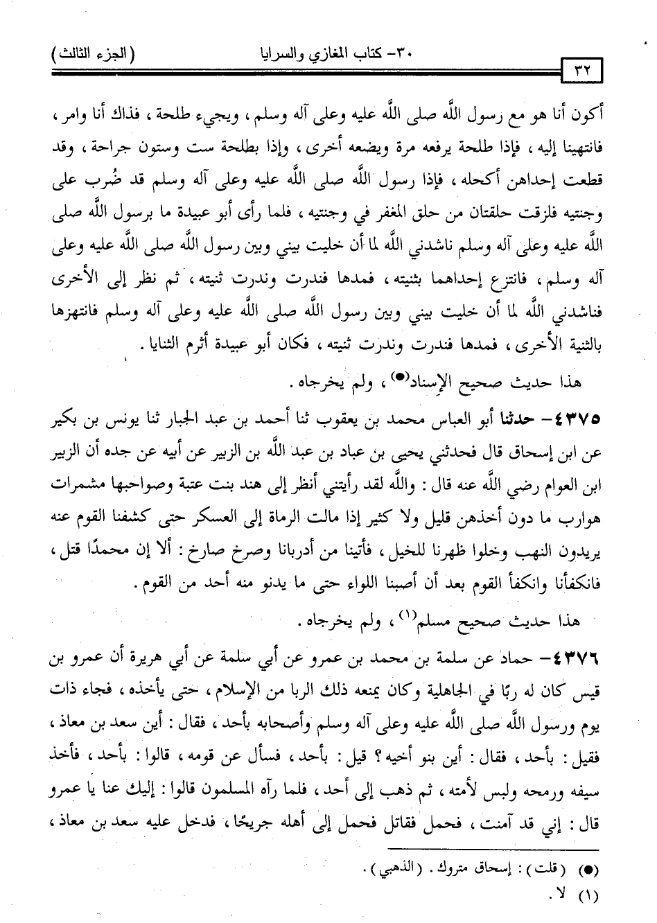 4375 - حَدَّثَنَا أَبُو الْعَبَّاسِ مُحَمَّدُ بْنُ يَعْقُوبَ ، ثنا أَحْمَدُ بْنُ عَبْدِ الْجَبَّارِ ، ثنا يُونُسُ بْنُ بُكَيْرٍ ، عَنِ ابْنِ إِسْحَاقَ ، قَالَ: فَحَدَّثَنِي يَحْيَى بْنُ عَبَّادِ بْنِ عَبْدِ اللَّهِ بْنِ الزُّبَيْرِ ، عَنْ أَبِيهِ ، عَنْ جَدِّهِ ، أَنَّ الزُّبَيْرَ بْنَ الْعَوَّامِ رَضِيَ اللَّهُ عَنْهُ قَالَ: " وَاللَّهِ لَقَدْ رَأَيْتُنِي أَنْظُرُ إِلَى هِنْدِ بِنْتِ عُتْبَةَ وَصَوَاحِبَهَا مُشَمِّرَاتٍ هَوَارِبَ مَا دُونَ أَخْذِهِنَّ قَلِيلٌ وَلَا كَثِيرٌ ، إِذْ مَالَتِ الرُّمَاةُ إِلَى الْعَسْكَرِ ، حَتَّى كَشَفَنَا الْقَوْمُ عَنْهُ يُرِيدُونَ النَّهْبَ ، وَخَلَّوْا ظَهْرَنَا لِلْخَيْلِ ، فَأُتِيِنَا مِنْ أَدْبَارِنَا ، وَصَرَخَ صَارِخٌ إِلَّا أَنَّ مُحَمَّدًا قُتِلَ فَانْكَفَأْنَا ، وَانْكَفَأَ الْقَوْمُ بَعْدَ أَنْ أَصَبْنَا اللِّوَاءَ حَتَّى مَا يَدْنُو مِنْهُ أَحَدٌ مِنَ الْقَوْمِ "