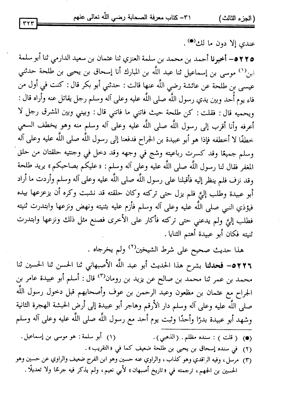 5225 - أَخْبَرَنَا أَحْمَدُ بْنُ مُحَمَّدِ بْنِ سَلَمَةَ الْعَنَزِيُّ ، ثنا عُثْمَانُ بْنُ سَعِيدٍ الدَّارِمِيُّ ، ثنا أَبُو سَلَمَةَ بْنُ مُوسَى بْنِ إِسْمَاعِيلَ ، ثنا عَبْدُ اللَّهِ بْنُ الْمُبَارَكِ ، أَنَا إِسْحَاقُ بْنُ يَحْيَى بْنِ طَلْحَةَ ، حَدَّثَنِي عِيسَى بْنُ طَلْحَةَ ، عَنْ عَائِشَةَ رَضِيَ اللَّهُ عَنْهَا قَالَتْ: حَدَّثَنِي أَبُو بَكْرٍ قَالَ: كُنْتُ فِي أَوَّلِ مَنْ فَاءَ يَوْمَ أُحُدٍ وَبَيْنَ يَدَيْ رَسُولِ اللَّهِ صَلَّى اللَّهُ عَلَيْهِ وَسَلَّمَ رَجُلٌ يُقَاتِلُ عَنْهُ وَأُرَاهُ قَالَ: وَيَحْمِيهِ ، قَالَ: فَقُلْتُ: كُنْ طَلْحَةَ حَيْثُ فَاتَنِي مَا فَاتَنِي ، قَالَ: وَبَيْنِي وَبَيْنَ الْمَشْرِقِ رَجُلٌ لَا أَعْرِفُهُ ، وَأَنَا أَقْرَبُ إِلَى رَسُولِ اللَّهِ صَلَّى اللَّهُ عَلَيْهِ وَسَلَّمَ مِنْهُ وَهُوَ يَخْطَفُ السَّعْيَ خْطْفًا لَا أَخْطَفُهُ ، فَإِذَا هُوَ أَبُو عُبَيْدَةَ بْنُ الْجَرَّاحِ ، فَدَفَعْنَا إِلَى رَسُولِ اللَّهِ صَلَّى اللَّهُ عَلَيْهِ وَسَلَّمَ جَمِيعًا ، وَقَدْ كُسِرَتْ رُبَاعِيَّتُهُ وَشُجَّ فِي وَجْهِهِ ، وَقَدْ دَخَلَ فِي وَجْنَتَيْهِ حَلْقَتَانِ مِنْ حِلَقِ الْمِغْفَرِ ، فَقَالَ لَنَا رَسُولُ اللَّهِ صَلَّى اللَّهُ عَلَيْهِ وَسَلَّمَ: " عَلَيْكُمْ بِصَاحِبِكُمْ " يُرِيدُ طَلْحَةَ ، وَقَدْ نَزَفَ فَلَمْ يَنْظُرْ إِلَيْهِ ، فَأَقْبَلْنَا عَلَى رَسُولِ اللَّهِ صَلَّى اللَّهُ عَلَيْهِ وَسَلَّمَ ، وَأَرَدْتُ مَا أَرَادَ أَبُو عُبَيْدَةَ ، وَطَلَبَ إِلَيَّ فَلَمْ يَزَلْ حَتَّى تَرَكْتُهُ ، وَكَانَ حَلْقَتُهُ قَدْ نَشِبَتْ ، وَكَرِهَ أَنْ يُزَعْزِعَهَا بِيَدِهِ فَيُؤْذِيَ النَّبِيَّ صَلَّى اللَّهُ عَلَيْهِ وَسَلَّمَ ، فَأَزَّمَ عَلَيْهِ بِثَنِيَّتِهِ ، وَنَهَضَ وَنَزَعَهَا ، وَابْتَدَرَتْ ثَنِيَّتُهُ فَطَلَبَ إِلَيَّ وَلَمْ يَدَعْنِي حَتَّى تَرَكْتُهُ فَأَكَارَ عَلَى الْأُخْرَى ، فَصَنَعَ مِثْلَ ذَلِكَ وَنَزَعَهَا ، وَابْتَدَرَتْ ثَنِيَّتُهُ فَكَانَ أَبُو عُبَيْدَةَ أَهْتَمَ الثَّنَايَا