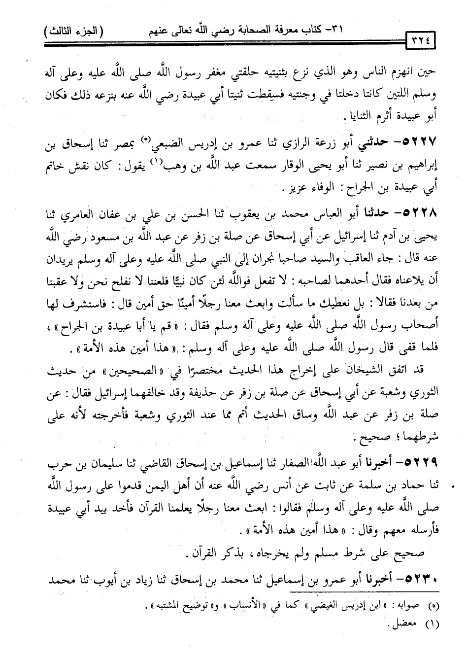 5228 - حَدَّثَنَا أَبُو الْعَبَّاسِ مُحَمَّدُ بْنُ يَعْقُوبَ ، ثنا الْحَسَنُ بْنُ عَلِيِّ بْنِ عَفَّانَ الْعَامِرِيُّ ، ثنا يَحْيَى بْنُ آدَمَ ، ثنا إِسْرَائِيلُ ، عَنْ أَبِي إِسْحَاقَ ، عَنْ صِلَةَ بْنِ زُفَرَ ، عَنْ عَبْدِ اللَّهِ بْنِ مَسْعُودٍ رَضِيَ اللَّهُ عَنْهُ ، قَالَ: جَاءَ الْعَاقِبُ وَالسَّيِّدُ صَاحِبَا نَجْرَانَ إِلَى النَّبِيِّ صَلَّى اللَّهُ عَلَيْهِ وَسَلَّمَ يُرِيدَانِ أَنْ يُلَاعِنَاهُ ، فَقَالَ أَحَدُهُمَا لِصَاحِبِهِ: لَا تَفْعَلْ ، فَوَاللَّهِ لَئِنْ كَانَ نَبِيًّا فَلَعَنَنَا لَا نَفْلَحُ نَحْنُ وَلَا عَقِبُنَا مِنْ بَعْدِنَا ، فَقَالَا: بَلْ نُعْطِيكَ مَا سَأَلْتَ ، وَابْعَثْ مَعَنَا رَجُلًا أَمِينًا حَقَّ أَمِينٍ ، قَالَ: فَاسْتَشْرَفَ لَهَا أَصْحَابُ رَسُولِ اللَّهِ صَلَّى اللَّهُ عَلَيْهِ وَسَلَّمَ ، فَقَالَ: " قُمْ يَا أَبَا عُبَيْدَةَ بْنَ الْجَرَّاحِ " فَلَمَّا قَفَّى قَالَ رَسُولُ اللَّهِ صَلَّى اللَّهُ عَلَيْهِ وَسَلَّمَ: " هَذَا أَمِينُ هَذِهِ الْأُمَّةِ "