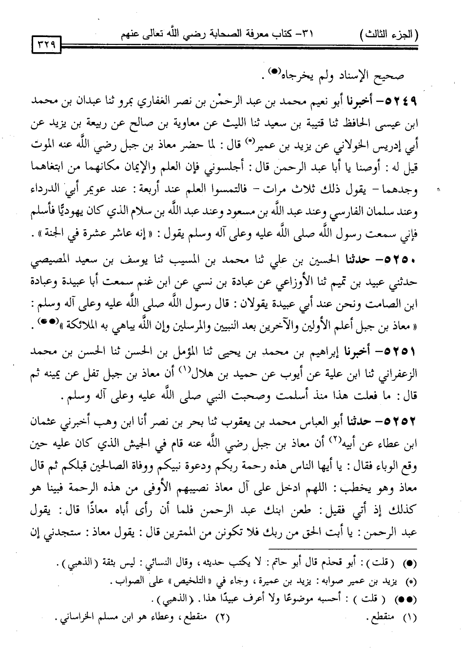 5249 - أَخْبَرَنَا أَبُو نُعَيْمٍ مُحَمَّدُ بْنُ عَبْدِ الرَّحْمَنِ بْنِ نَصْرٍ الْغِفَارِيُّ بِمَرْوَ ، ثنا عَبْدَانُ بْنُ مُحَمَّدِ بْنِ عِيسَى الْحَافِظُ ، ثنا قُتَيْبَةُ بْنُ سَعْدٍ ، ثنا اللَّيْثُ ، عَنْ مُعَاوِيَةَ بْنِ صَالِحٍ ، عَنْ رَبِيعَةَ بْنِ يَزِيدَ ، عَنْ أَبِي إِدْرِيسَ الْخَوْلَانِيِّ ، عَنْ يَزِيدَ بْنِ عُمَيْرٍ قَالَ: لَمَّا حَضَرَ مُعَاذَ بْنَ جَبَلٍ رَضِيَ اللَّهُ عَنْهُ الْمَوْتُ قِيلَ لَهُ: أَوْصِنَا يَا أَبَا عَبْدِ الرَّحْمَنِ ، قَالَ: " أَجْلِسُونِي ، فَإِنَّ الْعِلْمَ وَالْإِيمَانَ مَكَانَهُمَا مَنَ ابْتَغَاهُمَا وَجَدَهُمَا ، يَقُولُ ذَلِكَ ثَلَاثَ مَرَّاتٍ ، فَالْتَمِسُوا الْعِلْمَ عِنْدَ أَرْبَعَةٍ: عِنْدَ عُوَيْمِرٍ أَبِي الدَّرْدَاءِ ، وَعِنْدَ سَلْمَانَ الْفَارِسِيِّ ، وَعِنْدَ عَبْدِ اللَّهِ بْنِ مَسْعُودٍ ، وَعِنْدَ عَبْدِ اللَّهِ بْنِ سَلَّامٍ الَّذِي كَانَ يَهُودِيًّا فَأَسْلَمَ ، فَإِنِّي سَمِعْتُ رَسُولَ اللَّهِ صَلَّى اللَّهُ عَلَيْهِ وَسَلَّمَ ، يَقُولُ: " أَنَّهُ عَاشِرُ عَشْرَةٍ فِي الْجَنَّةِ "