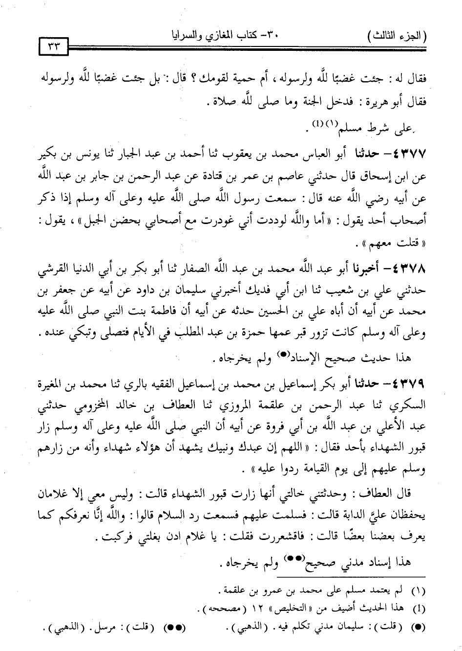4379 - حَدَّثَنَا أَبُو بَكْرٍ إِسْمَاعِيلُ بْنُ مُحَمَّدِ بْنِ إِسْمَاعِيلَ الْفَقِيهُ بِالرِّيِّ ، ثنا مُحَمَّدُ بْنُ الْمُغِيرَةِ السُّكَّرِيُّ ، ثنا عَبْدُ الرَّحْمَنِ بْنُ عَلْقَمَةَ الْمَرْوَزِيُّ ، ثنا الْعَطَّافُ بْنُ خَالِدٍ الْمَخْزُومِيُّ ، حَدَّثَنِي عَبْدُ الْأَعْلَى بْنُ عَبْدِ اللَّهِ بْنِ أَبِي فَرْوَةَ ، عَنْ أَبِيهِ ، أَنَّ النَّبِيَّ صَلَّى اللَّهُ عَلَيْهِ وَسَلَّمَ زَارَ قُبُورَ الشُّهَدَاءِ بِأُحُدٍ فَقَالَ: " اللَّهُمَّ إِنَّ عَبْدَكَ وَنَبِيَّكَ يَشْهَدُ أَنَّ هَؤُلَاءِ شُهَدَاءُ ، وَأَنَّهُ مَنْ زَارَهُمْ وَسَلَّمَ عَلَيْهِمْ إِلَى يَوْمِ الْقِيَامَةِ رَدُّوا عَلَيْهِ " قَالَ الْعَطَّافُ: وَحَدَّثَتْنِي خَالَتِي ، أَنَّهَا زَارَتْ قُبُورَ الشُّهَدَاءِ ، قَالَتْ: " وَلَيْسَ مَعِي إِلَّا غُلَامَانِ يَحْفَظَانِ عَلَيَّ الدَّابَّةَ ، قَالَتْ: فَسَلَّمْتُ عَلَيْهِمْ فَسَمِعْتُ رَدَّ السَّلَامِ ، قَالُوا: وَاللَّهِ إِنَّا نَعْرِفُكُمْ كَمَا يَعْرِفُ بَعْضُنَا بَعْضًا ، قَالَتْ: فَاقْشَعْرَرْتُ ، فَقُلْتُ: يَا غُلَامُ ادْنُ بَغْلَتِي فَرَكِبْتُ "