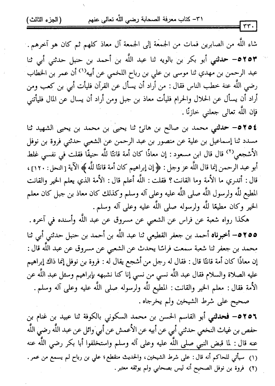 5255 - أَخْبَرْنَاهُ أَحْمَدُ بْنُ جَعْفَرٍ الْقَطِيعِيُّ ، ثنا عَبْدُ اللَّهِ بْنُ أَحْمَدَ بْنِ حَنْبَلٍ ، حَدَّثَنِي أَبِي ، ثنا مُحَمَّدُ بْنُ جَعْفَرٍ ، ثنا شُعْبَةُ ، سَمِعْتُ فِرَاسًا يُحَدِّثُ ، عَنِ الشَّعْبِيِّ ، عَنْ مَسْرُوقٍ ، عَنْ عَبْدِ اللَّهِ قَالَ: " إِنَّ مُعَاذًا كَانَ أُمَّةً قَانِتًا " ، قَالَ: فَقَالَ لَهُ رَجُلٌ مِنْ أَشْجَعَ يُقَالُ لَهُ فَرْوَةُ بْنُ نَوْفَلٍ: إِنَّمَا ذَاكَ إِبْرَاهِيمُ عَلَيْهِ الصَّلَاةُ وَالسَّلَامُ ، فَقَالَ عَبْدُ اللَّهِ: " نَسِيَ مَنْ نَسِيَ ، إِنَّا كُنَّا نُشَبِّهُهُ بِإِبْرَاهِيمَ " ، وَسُئِلَ عَبْدُ اللَّهِ عَنِ الْأُمَّةِ ، فَقَالَ: " مُعَلِّمُ الْخَيْرِ ، وَالْقَانِتُ الْمُطِيعُ لِلَّهِ وَلِرَسُولِهِ صَلَّى اللَّهُ عَلَيْهِ وَسَلَّمَ ، فَقَالَ عَبْدُ اللَّهِ: " نَسِيَ مَنْ نَسِيَ ، إِنَّا كُنَّا نُشَبِّهُهُ بِإِبْرَاهِيمَ " ، وَسُئِلَ عَبْدُ اللَّهِ عَنِ الْأُمَّةِ ، فَقَالَ: " مُعَلِّمُ الْخَيْرِ ، وَالْقَانِتُ الْمُطِيعُ لِلَّهِ وَلِرَسُولِهِ صَلَّى اللَّهُ عَلَيْهِ وَسَلَّمَ "