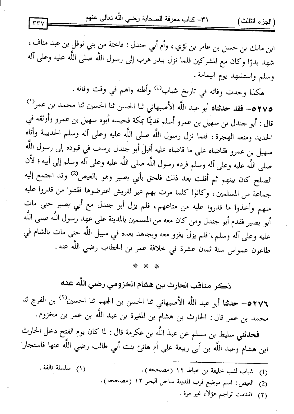 5275 - فَقَدْ حَدَّثَنَاهُ أَبُو عَبْدِ اللَّهِ الْأَصْبَهَانِيُّ ، ثنا الْحَسَنُ ، ثنا الْحُسَيْنُ ، ثنا مُحَمَّدُ بْنُ عُمَرَ قَالَ: " أَبُو جَنْدَلِ بْنُ سُهَيْلِ بْنِ عَمْرٍو أَسْلَمَ قَدِيمًا بِمَكَّةَ فَحَبَسَهُ أَبُوهُ سُهَيْلِ بْنُ عَمْرٍو وَأَوْثَقَهُ فِي الْحَدِيدِ وَمَنَعَهُ الْهِجْرَةَ ، فَلَمَّا نَزَلَ رَسُولُ اللَّهِ صَلَّى اللَّهُ عَلَيْهِ وَسَلَّمَ الْحُدَيْبِيَةَ وَأَتَاهُ سُهَيْلُ بْنُ عَمْرٍو فَقَاضَاهُ عَلَى مَا قَاضَاهُ عَلَيْهِ ، أَقْبَلَ أَبُو جَنْدَلٍ يَرْسُفُ فِي قُيُودِهِ إِلَى رَسُولِ اللَّهِ صَلَّى اللَّهُ عَلَيْهِ وَسَلَّمَ ، فَرَدَّهُ رَسُولُ اللَّهِ صَلَّى اللَّهُ عَلَيْهِ وَسَلَّمَ إِلَى أَبِيهِ ؛ لِأَنَّ الصُّلْحَ كَانَ بَيْنَهُمْ ، ثُمَّ أَفْلَتَ بَعْدَ ذَلِكَ ، فَلَحِقَ بِأَبِي بَصِيرٍ وَهُوَ بِالْعِيصِ وَقَدِ اجْتَمَعَ إِلَيْهِ جَمَاعَةٌ مِنَ الْمُسْلِمِينَ وَكَانُوا كُلَّمَا مَرَّتْ بِهِمْ عِيرٌ لِقُرَيْشٍ اعْتَرَضُوهَا فَقَتَلُوا مَنْ قَدَرُوا عَلَيْهِ مِنْهُمْ ، وَأَخَذُوا مَا قَدَرُوا عَلَيْهِ مِنْ مَتَاعِهِمْ ، فَلَمْ يَزَلْ أَبُو جَنْدَلٍ مَعَ أَبِي بَصِيرٍ حَتَّى مَاتَ أَبُو بَصِيرٍ فَقَدِمَ أَبُو جَنْدَلٍ وَمَنْ كَانَ مَعَهُ مِنَ الْمُسْلِمِينَ بِالْمَدِينَةِ عَلَى عَهْدِ رَسُولِ اللَّهِ صَلَّى اللَّهُ عَلَيْهِ وَسَلَّمَ ، فَلَمْ يَزَلْ يَغْزُو مَعَهُ وَيُجَاهِدُ بَعْدَهُ فِي سَبِيلِ اللَّهِ حَتَّى مَاتَ بِالشَّامِ فِي طَاعُونِ عَمَوَاسٍ سَنَةَ ثَمَانَ عَشْرَةَ فِي خِلَافَةِ عُمَرَ بْنِ الْخَطَّابِ رَضِيَ اللَّهُ عَنْهُ "