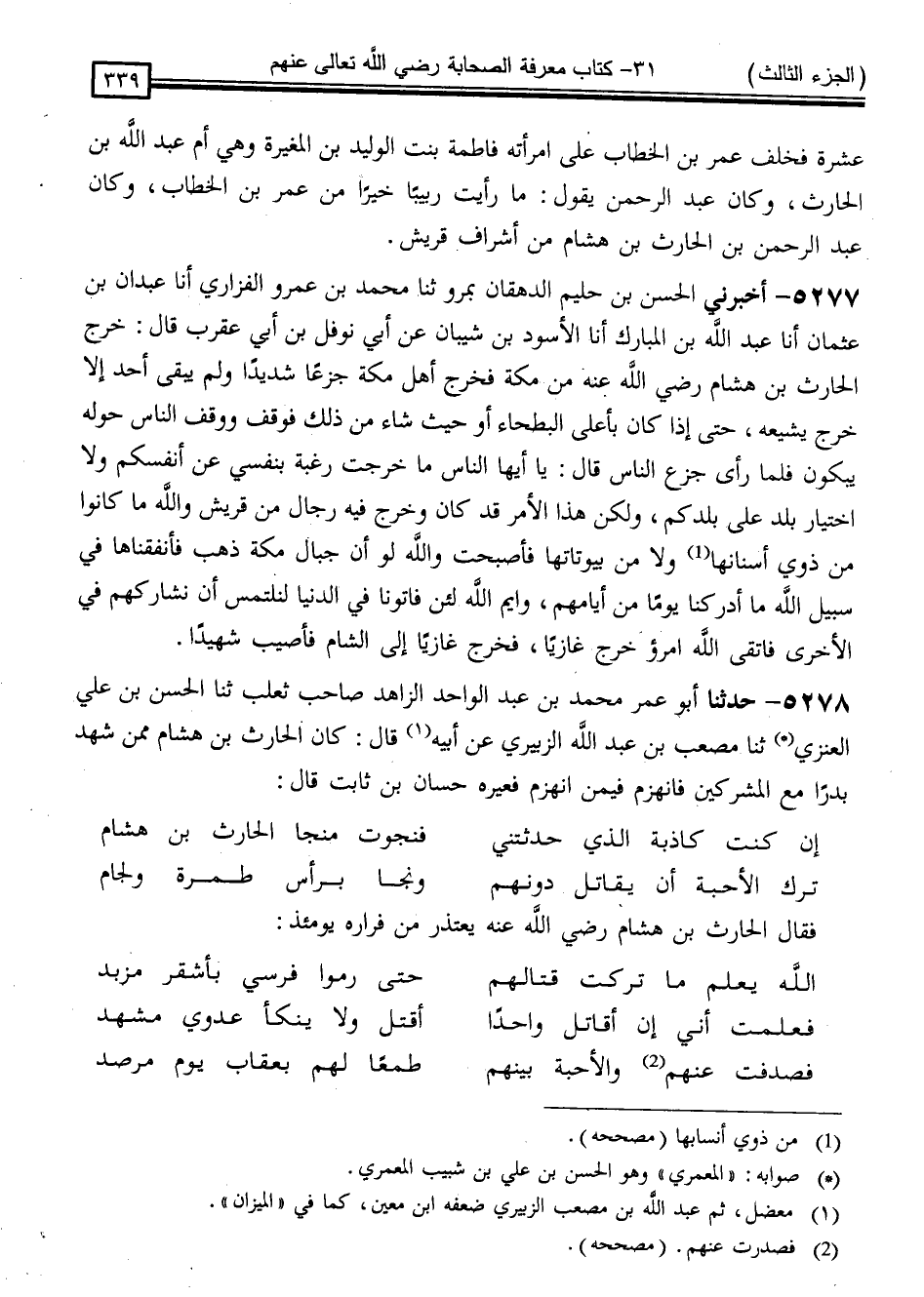 5278 - حَدَّثَنَا أَبُو عُمَرَ مُحَمَّدُ بْنُ عَبْدِ الْوَاحِدِ الزَّاهِدُ صَاحِبُ ثَعْلَبٍ ، ثنا الْحَسَنُ بْنُ عَلِيٍّ الْعَنَزِيُّ ، ثنا مُصْعَبُ بْنُ عَبْدِ اللَّهِ الزُّبَيْرِيُّ ، عَنْ أَبِيهِ قَالَ: كَانَ الْحَارِثُ بْنُ هِشَامٍ مِمَّنْ شَهِدَ بَدْرًا مَعَ الْمُشْرِكِينَ ، فَانْهَزَمَ فِيمَنِ انْهَزَمَ ، فَعَيَّرَهُ حَسَّانُ بْنُ ثَابِتٍ قَالَ: