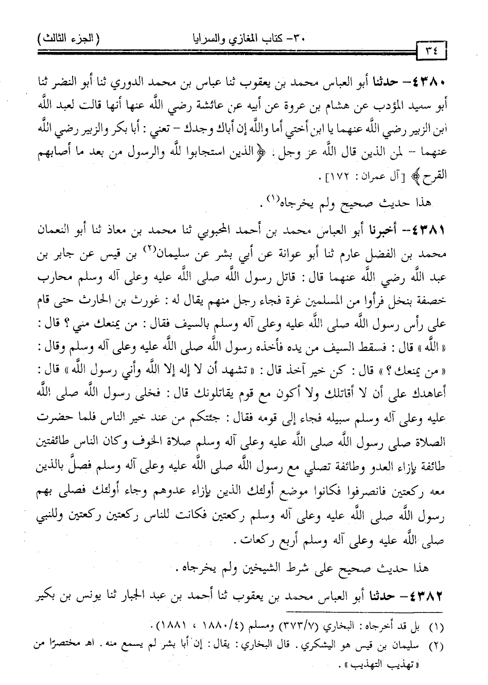 4381 - أَخْبَرَنَا أَبُو الْعَبَّاسِ مُحَمَّدُ بْنُ أَحْمَدَ الْمَحْبُوبِيُّ ، ثنا مُحَمَّدُ بْنُ مُعَاذٍ ، ثنا أَبُو النُّعْمَانِ مُحَمَّدُ بْنُ الْفَضْلِ عَارِمٌ ، ثنا أَبُو عَوَانَةَ ، عَنْ أَبِي بِشْرٍ ، عَنْ سُلَيْمَانَ بْنِ قَيْسٍ ، عَنْ جَابِرِ بْنِ عَبْدِ اللَّهِ رَضِيَ اللَّهُ عَنْهُمَا قَالَ: قَاتَلَ رَسُولُ اللَّهِ صَلَّى اللَّهُ عَلَيْهِ وَسَلَّمَ مُحَارِبَ خَصَفَةَ بِنَخْلٍ ، فَرَأَوْا مِنَ الْمُسْلِمِينَ غُرَّةً ، فَجَاءَ رَجُلٌ مِنْهُمْ يُقَالُ لَهُ غَوْرَثُ بْنُ الْحَارِثِ حَتَّى قَامَ عَلَى رَأْسِ رَسُولِ اللَّهِ صَلَّى اللَّهُ عَلَيْهِ وَسَلَّمَ بِالسَّيْفِ ، فَقَالَ: مَنْ يَمْنَعُكَ مِنِّي ؟ قَالَ: " اللَّهُ " قَالَ: فَسَقَطَ السَّيْفُ مِنْ يَدِهِ ، فَأَخَذَهُ رَسُولُ اللَّهِ صَلَّى اللَّهُ عَلَيْهِ وَسَلَّمَ ، وَقَالَ: " مَنْ يَمْنَعُكَ ؟ " قَالَ: كُنْ خَيْرَ آخِذٍ ، قَالَ: " تَشْهَدُ أَنَّ لَا إِلَهَ إِلَّا اللَّهُ وَأَنِّي رَسُولُ اللَّهِ ؟ " قَالَ: أُعَاهِدُكَ عَلَى أَنْ لَا أُقَاتِلَكَ ، وَلَا أَكُونُ مَعَ قَوْمٍ يُقَاتِلُونَكَ ، قَالَ: فَخَلَّى رَسُولُ اللَّهِ صَلَّى اللَّهُ عَلَيْهِ وَسَلَّمَ سَبِيلَهُ فَجَاءَ إِلَى قَوْمِهِ ، فَقَالَ: جِئْتُكُمْ مِنْ عِنْدِ خَيْرِ النَّاسِ ، فَلَمَّا حَضَرَتِ الصَّلَاةُ صَلَّى رَسُولُ اللَّهِ صَلَّى اللَّهُ عَلَيْهِ وَسَلَّمَ صَلَاةَ الْخَوْفِ ، وَكَانَ النَّاسُ طَائِفَتَيْنِ ، طَائِفَةٌ بِإِزَاءِ الْعَدُوِّ ، وَطَائِفَةٌ تُصَلِّي مَعَ رَسُولِ اللَّهِ صَلَّى اللَّهُ عَلَيْهِ وَسَلَّمَ ، فَصَلَّى بِالَّذِينَ مَعَهُ رَكْعَتَيْنِ ، فَانْصَرَفُوا فَكَانُوا مَوْضِعَ أُولَئِكَ الَّذِينَ بِإِزَاءِ عَدُوِّهِمْ ، وَجَاءَ أُولَئِكَ فَصَلَّى بِهِمْ رَسُولُ اللَّهِ صَلَّى اللَّهُ عَلَيْهِ وَسَلَّمَ رَكْعَتَيْنِ فَكَانَتْ لِلنَّاسِ رَكْعَتَيْنِ رَكْعَتَيْنِ ، وَلِلنَّبِيِّ صَلَّى اللَّهُ عَلَيْهِ وَسَلَّمَ أَرْبَعُ رَكَعَاتٍ