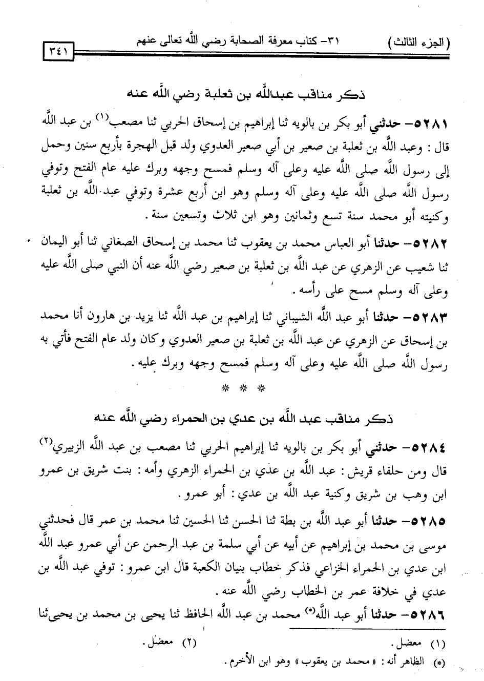 5281 - حَدَّثَنِي أَبُو بَكْرِ بْنُ بَالَوَيْهِ ، ثنا إِبْرَاهِيمُ بْنُ إِسْحَاقَ الْحَرْبِيُّ ، ثنا مُصْعَبُ بْنُ عَبْدِ اللَّهِ قَالَ: " وَعَبْدُ اللَّهِ بْنُ ثَعْلَبَةَ بْنِ صُعَيْرِ بْنِ أَبِي صُعَيْرٍ الْعَدَوِيُّ وُلِدَ قَبْلَ الْهِجْرَةِ بِأَرْبَعِ سِنِينَ وَحُمِلَ إِلَى رَسُولِ اللَّهِ صَلَّى اللَّهُ عَلَيْهِ وَسَلَّمَ فَمَسَحَ وَجْهَهُ وَبَرَّكَ عَلَيْهِ عَامَ الْفَتْحِ ، وَتُوُفِيَ رَسُولُ اللَّهِ صَلَّى اللَّهُ عَلَيْهِ وَسَلَّمَ وَهُوَ ابْنُ أَرْبَعَ عَشْرَةَ ، وَتُوُفِّيَ عَبْدُ اللَّهِ بْنُ ثَعْلَبَةَ ، وَكُنْيَتُهُ أَبُو مُحَمَّدٍ سَنَةَ تِسْعَ وَثَمَانِينَ وَهُوَ ابْنُ ثَلَاثٍ وَتِسْعِينَ سَنَةً "