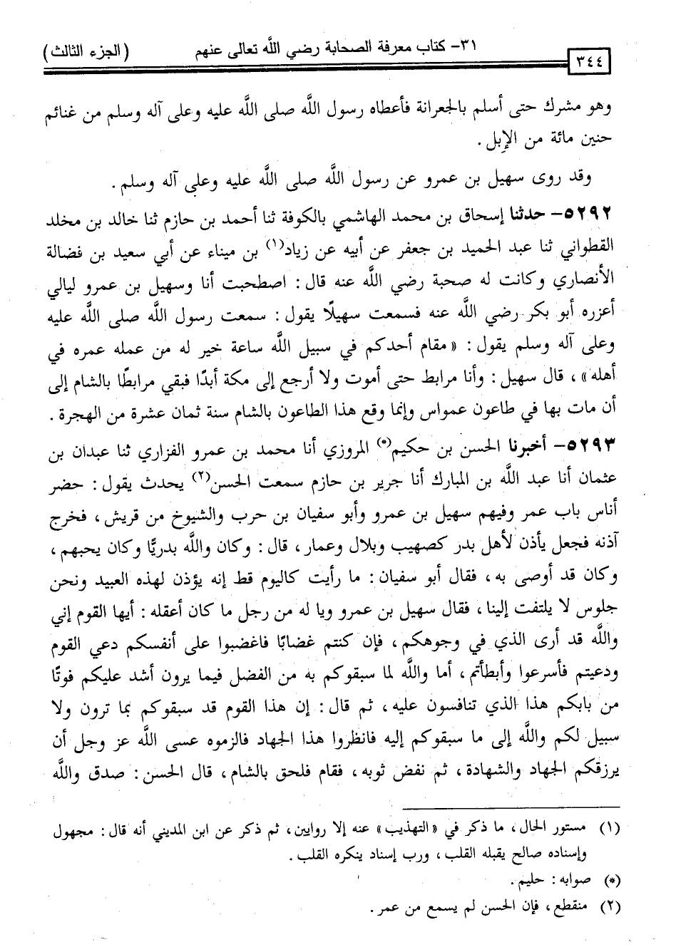 5293 - أَخْبَرَنَا الْحَسَنُ بْنُ حَلِيمٍ الْمَرْوَزِيُّ ، أَنَا مُحَمَّدُ بْنُ عَمْرٍو الْفَزَارِيُّ ، ثنا عَبْدَانُ بْنُ عُثْمَانَ ، أَنَا عَبْدُ اللَّهِ بْنُ الْمُبَارَكِ ، أَنَا جَرِيرُ بْنُ حَازِمٍ ، سَمِعْتُ الْحَسَنَ يُحَدِّثُ ، يَقُولُ: حَضَرَ أُنَاسٍ بَابَ عُمَرَ وَفِيهِمْ سُهَيْلُ بْنُ عَمْرٍو وَأَبُو سُفْيَانَ بْنُ حَرْبٍ وَالشُّيُوخُ مِنْ قُرَيْشٍ ، فَخَرَجَ آذِنُهُ فَجَعَلَ يَأْذَنُ لِأَهْلِ بَدْرٍ كَصُهَيْبٍ وَبِلَالٍ وَعَمَّارٍ ، قَالَ: وَكَانَ وَاللَّهِ بَدْرِيًّا وَكَانَ يُحِبُّهُمْ ، وَكَانَ قَدْ أَوْصَى بِهِ ، فَقَالَ أَبُو سُفْيَانَ: مَا رَأَيْتُ كَالْيَوْمِ قَطُّ ، أَنَّهُ يُؤْذَنُ لِهَذِهِ الْعَبِيدِ وَنَحْنُ جُلُوسٌ لَا يُلْتَفَتُ إِلَيْنَا ، فَقَالَ سُهَيْلُ بْنُ عَمْرٍو ـ وَيَا لَهُ مِنْ رَجُلٍ مَا كَانَ أَعْقَلَهُ ـ: " أَيُّهَا الْقَوْمُ إِنِّي وَاللَّهِ قَدْ أَرَى الَّذِي فِي وُجُوهِكُمْ ، فَإِنْ كُنْتُمْ غِضَابًا فَاغْضَبُوا عَلَى أَنْفُسِكُمْ ، دُعِيَ الْقَوْمُ وَدُعِيتُمْ ، فَأَسْرَعُوا وَأَبْطَأْتُمْ ، أَمَا وَاللَّهِ لِمَا سَبَقُوكُمْ بِهِ مِنَ الْفَضْلِ فِيمَا يَرَوْنَ أَشَدَّ عَلَيْكُمْ فَوْتًا مِنْ بَابِكُمْ هَذَا الَّذِي تَنَافَسُونَ عَلَيْهِ " ثُمَّ قَالَ: " إِنَّ هَذَا الْقَوْمَ قَدْ سَبَقُوكُمْ بِمَا تَرَوْنَ ، وَلَا سَبِيلَ لَكُمْ وَاللَّهِ إِلَى مَا سَبَقُوكُمْ إِلَيْهِ ، فَانْظُرُوا هَذَا الْجِهَادَ فَالْزَمُوهُ ، عَسَى اللَّهُ عَزَّ وَجَلَّ أَنْ يَرْزُقَكُمُ الْجِهَادَ وَالشَّهَادَةَ " ثُمَّ نَفَضَ ثَوْبَهُ فَقَامَ فَلَحِقَ بِالشَّامِ قَالَ الْحَسَنُ: " صَدَقَ وَاللَّهِ ، -[345]- لَا يَجْعَلُ اللَّهُ عَبْدًا أَسْرَعَ إِلَيْهِ كَعَبْدٍ أَبْطَأَ عَنْهُ "
