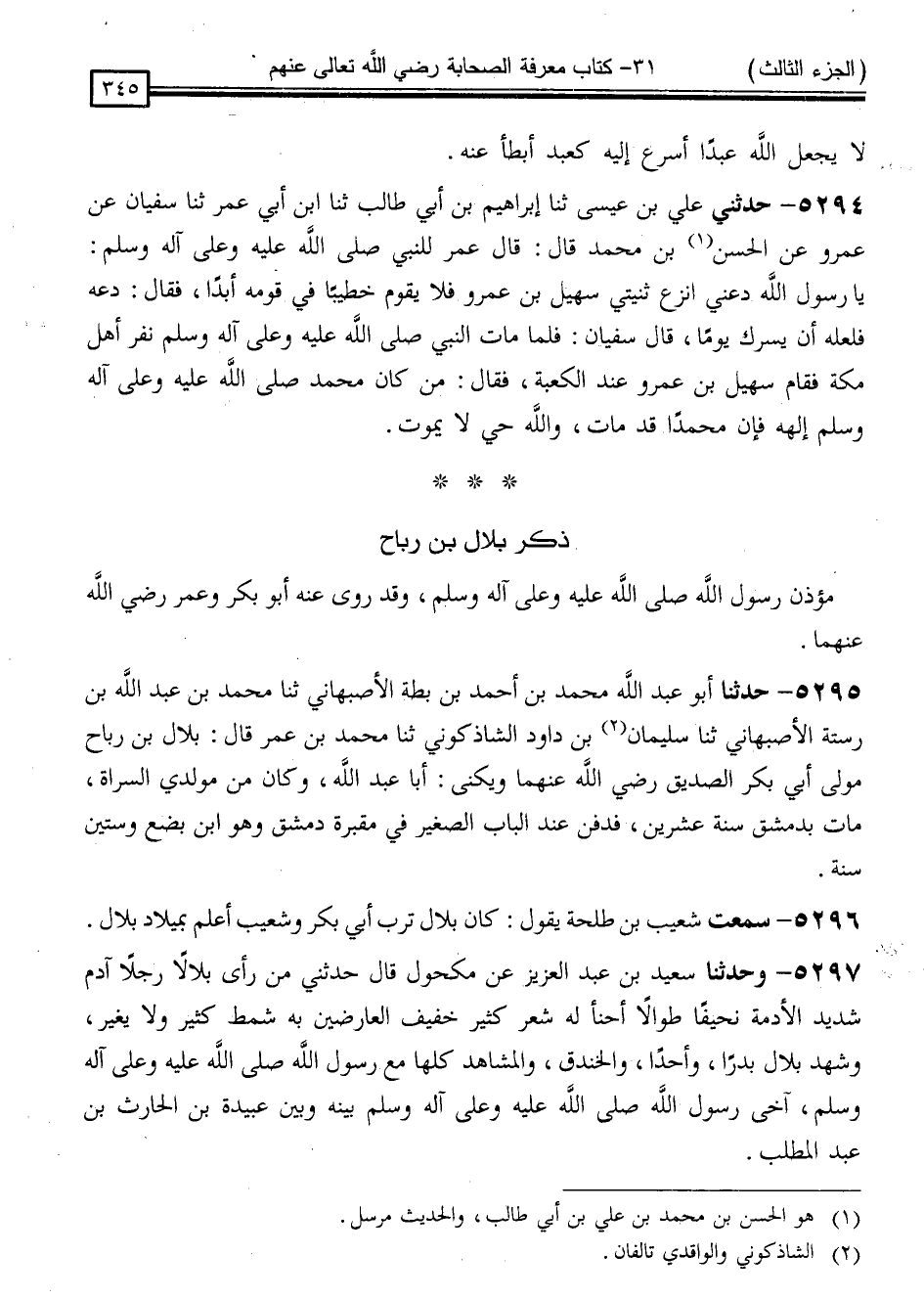 5295 - حَدَّثَنَا أَبُو عَبْدِ اللَّهِ مُحَمَّدُ بْنُ أَحْمَدَ بْنِ بُطَّةَ الْأَصْبَهَانِيُّ ، ثنا مُحَمَّدُ بْنُ عَبْدِ اللَّهِ بْنِ رُسْتَةَ الْأَصْبَهَانِيُّ ، ثنا سُلَيْمَانُ بْنُ دَاوُدَ الشَّاذَكُونِيُّ ، ثنا مُحَمَّدُ بْنُ عُمَرَ قَالَ: " بِلَالُ بْنُ رَبَاحٍ مَوْلَى أَبِي بَكْرٍ الصِّدِّيقِ رَضِيَ اللَّهُ عَنْهُمَا ، وَيُكَنَّى أَبَا عَبْدِ اللَّهِ ، وَكَانَ مِنْ مُوَلَّدِي السُّرَاةِ ، مَاتَ بِدِمَشْقَ سَنَةَ عِشْرِينَ فَدُفِنَ عِنْدَ الْبَابِ الصَّغِيرِ فِي مَقْبَرَةِ دِمَشْقَ وَهُوَ ابْنُ بِضْعٍ وَسِتِّينَ سَنَةً "