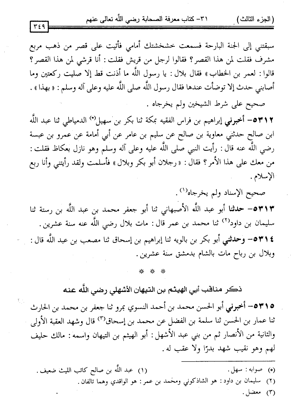 5315 - أَخْبَرَنِي أَبُو الْحَسَنِ مُحَمَّدُ بْنُ أَحْمَدَ النَّسَوِيِّ بِمَرْوَ ، ثنا جَعْفَرُ بْنُ مُحَمَّدِ بْنِ الْحَارِثِ ، ثنا عَمَّارُ بْنُ الْحَسَنِ ، ثنا سَلَمَةُ بْنُ الْفَضْلِ ، عَنْ مُحَمَّدِ بْنِ إِسْحَاقَ قَالَ: " وَشَهِدَ الْعَقَبَةَ الْأُولَى وَالثَّانِيَةَ مِنَ الْأَنْصَارِ ثُمَّ مِنْ بَنِي عَبْدِ الْأَشْهَلِ أَبُو الْهَيْثَمِ بْنُ التَّيْهَانِ ، وَاسْمُهُ مَالِكٌ حَلِيفٌ لَهُمْ وَهُوَ نَقِيبٌ ، شَهِدَ بَدْرًا وَلَا عَقِبَ لَهُ "