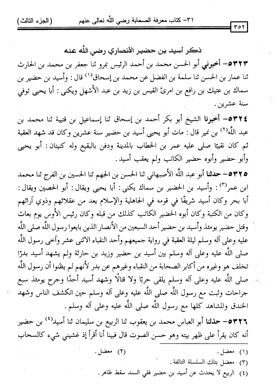 5325 - حَدَّثَنَا أَبُو عَبْدِ اللَّهِ الْأَصْبَهَانِيُّ ، ثَنَا الْحَسَنُ بْنُ الْجَهْمِ ، ثَنَا الْحُسَيْنُ بْنُ الْفَرَجِ ، ثَنَا مُحَمَّدُ بْنُ عُمَرَ ، " وَأُسَيْدُ بْنُ الْحُضَيْرِ بْنِ سِمَاكٍ يُكَنَّى أَبَا يَحْيَى وَيُقَالُ أَبُو الْحُصَيْنِ وَيُقَالُ: أَبَا بَحْرٍ ، وَكَانَ أُسَيْدٌ شَرِيفًا فِي قَوْمِهِ فِي الْجَاهِلِيَّةِ ، وَالْإِسْلَامِ يُعَدُّ مِنْ عُقَلَائِهِمْ وَذَوِي آرَائِهِمْ ، وَكَانَ مِنَ الْكَتَبَةِ ، وَكَانَ أَبُوهُ الْحُضَيْرِ الْكَاتِبَ كَذَلِكَ مَنْ قَبْلَهُ ، وَكَانَ رَئِيسَ الْأَوْسِ يَوْمَ بُعَاثَ ، وَقُتِلَ حُضَيْرٌ يَوْمَئِذٍ ، وَأُسَيْدُ بْنُ حُضَيْرٍ أَحَدُ السَّبْعِينَ مِنَ الْأَنْصَارِ الَّذِينَ بَايَعُوا رَسُولَ اللَّهِ صَلَّى اللَّهُ عَلَيْهِ وَسَلَّمَ لَيْلَةَ الْعَقَبَةِ فِي رِوَايَةٍ جَمِيعِهِمْ ، وَأَحَدُ النُّقَبَاءِ الِاثْنَيْ عَشَرَ ، وَآخَى رَسُولُ اللَّهِ صَلَّى اللَّهُ عَلَيْهِ وَسَلَّمَ بَيْنَ أُسَيْدِ بْنِ حُضَيْرٍ وَزَيْدِ بْنِ حَارِثَةَ وَلَمْ يَشْهَدْ أُسَيْدٌ بَدْرًا ، تَخَلَّفَ هُوَ وَغَيْرُهُ مِنْ أَكَابِرِ الصَّحَابَةِ مِنَ النُّقَبَاءِ وَغَيْرِهِمْ عَنْ بَدْرٍ ، لِأَنَّهُمْ لَمْ يَظُنُّوا أَنَّ رَسُولَ اللَّهِ صَلَّى اللَّهُ عَلَيْهِ وَسَلَّمَ يَلْقَى حَرْبًا وَلَا قِتَالًا ، وَشَهِدَ أُسَيْدٌ أُحُدًا وَجُرِحَ يَوْمَئِذٍ سَبْعَ جِرَاحَاتٍ ، وَثَبَتَ مَعَ رَسُولِ اللَّهِ صَلَّى اللَّهُ عَلَيْهِ وَسَلَّمَ حِينَ انْكَشَفَ النَّاسُ ، وَشَهِدَ الْخَنْدَقَ وَالْمَشَاهِدَ كُلَّهَا مَعَ رَسُولِ اللَّهِ صَلَّى اللَّهُ عَلَيْهِ وَسَلَّمَ "