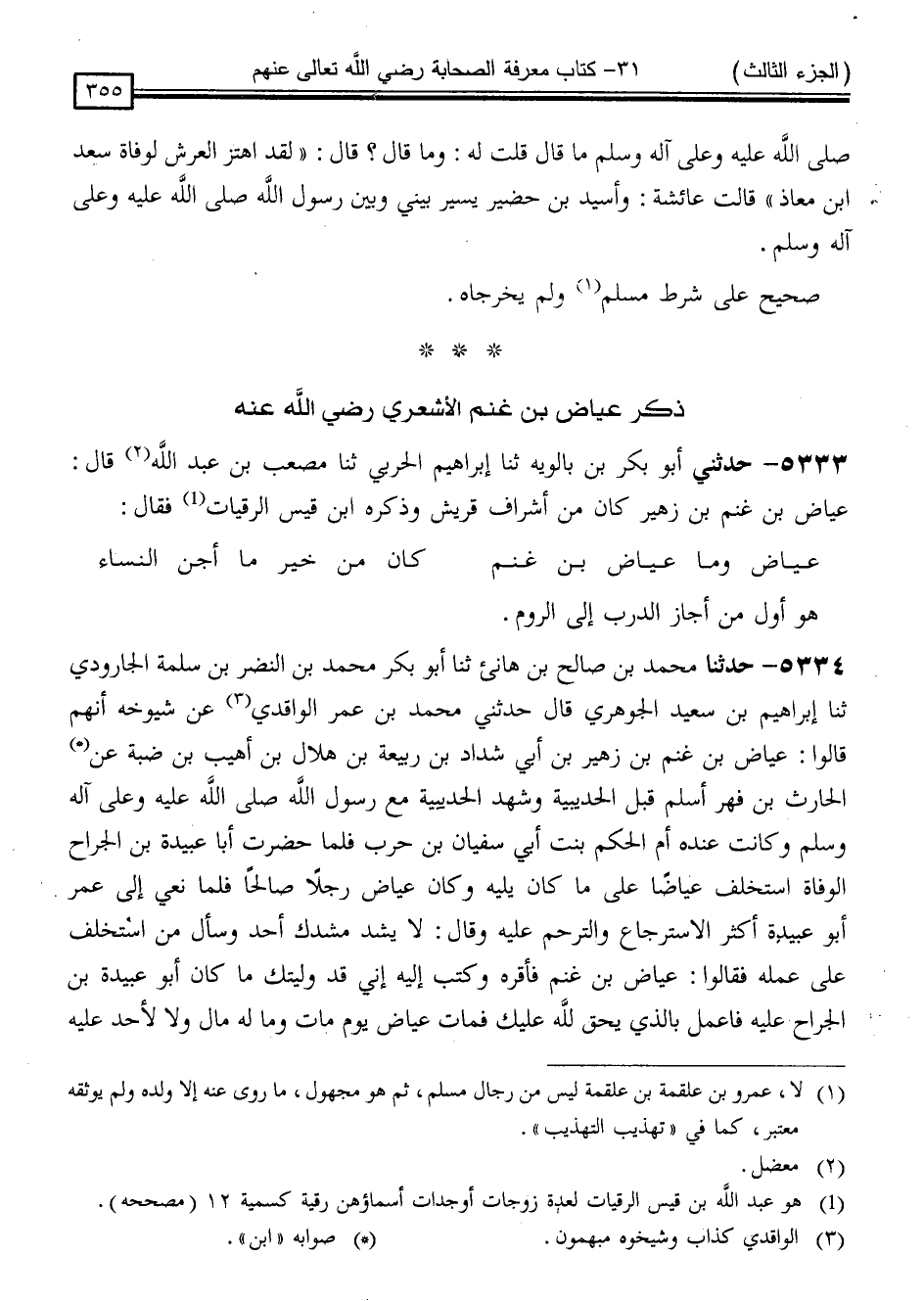 5334 - حَدَّثَنَا مُحَمَّدُ بْنُ صَالِحِ بْنِ هَانِئٍ ، ثَنَا أَبُو بَكْرٍ مُحَمَّدُ بْنُ النَّضْرِ بْنِ سَلَمَةَ الْجَارُودِيُّ ، ثَنَا إِبْرَاهِيمُ بْنُ سَعِيدٍ الْجَوْهَرِيُّ ، قَالَ: حَدَّثَنِي مُحَمَّدُ بْنُ عُمَرَ الْوَاقِدِيُّ ، عَنْ شُيُوخِهِ ، أَنَّهُمْ قَالُوا: " عِيَاضُ بْنُ غَنْمِ بْنِ زُهَيْرِ بْنِ أَبِي شَدَّادِ بْنِ رَبِيعَةَ بْنِ هِلَالِ بْنِ أَهْيَبَ بْنِ ضَبَّةَ بْنِ الْحَارِثِ بْنِ فِهْرٍ " أَسْلَمَ قَبْلَ الْحُدَيْبِيَةِ وَشَهِدَ الْحُدَيْبِيَةَ مَعَ رَسُولِ اللَّهِ صَلَّى اللَّهُ عَلَيْهِ وَسَلَّمَ ، وَكَانَتْ عِنْدَهُ أُمُّ الْحَكَمِ بِنْتِ أَبِي سُفْيَانَ بْنِ حَرْبٍ ، فَلَمَّا حَضَرَتْ أَبَا عُبَيْدَةَ بْنَ الْجَرَّاحِ الْوَفَاةُ اسْتَخْلَفَ عِيَاضًا عَلَى مَا كَانَ يَلِيهِ ، وَكَانَ عِيَاضٌ رَجُلًا صَالِحًا ، فَلَمَّا نُعِيَ إِلَى عُمَرَ أَبُو عُبَيْدَةَ أَكْثَرَ الِاسْتِرْجَاعَ وَالتَّرَحُّمَ عَلَيْهِ وَقَالَ: لَا يَشُدُّ مَشَدَّكِ أَحَدٌ وَسَأَلَ مَنِ اسْتُخْلِفَ عَلَى عَمَلِهِ ، فَقَالُوا: عِيَاضُ بْنُ غَنْمٍ فَأَقَرَّهُ وَكَتَبَ إِلَيْهِ: إِنِّي قَدْ وَلَّيْتُكَ مَا كَانَ أَبُو عُبَيْدَةَ بْنُ الْجَرَّاحِ عَلَيْهِ ، فَاعْمَلْ بِالَّذِي يَحِقُّ لِلَّهِ عَلَيْكَ ، فَمَاتَ عِيَاضٌ يَوْمَ مَاتَ ، وَمَا لَهُ مَالٌ وَلَا لِأَحَدٍ عَلَيْهِ -[356]- دَيْنٌ ، وَتُوُفِّيَ بِالشَّامِ سَنَةَ عِشْرِينَ وَهُوَ ابْنُ سِتِّينَ سَنَةً