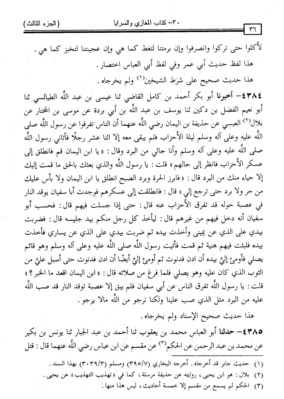 4384 - أَخْبَرَنَا أَبُو بَكْرٍ أَحْمَدُ بْنُ كَامِلٍ الْقَاضِي ، ثنا عِيسَى بْنُ عَبْدِ اللَّهِ الطَّيَالِسِيُّ ، ثنا أَبُو نُعَيْمٍ الْفَضْلُ بْنُ دُكَيْنٍ ، ثنا يُوسُفُ بْنُ عَبْدِ اللَّهِ بْنِ أَبِي بُرْدَةَ ، عَنْ مُوسَى بْنِ الْمُخْتَارِ ، عَنْ بِلَالٍ الْعَبْسِيِّ ، عَنْ حُذَيْفَةَ بْنِ الْيَمَانِ رَضِيَ اللَّهُ عَنْهُمَا ، أَنَّ النَّاسَ تَفَرَّقُوا عَنْ رَسُولِ اللَّهِ صَلَّى اللَّهُ عَلَيْهِ وَسَلَّمَ لَيْلَةَ الْأَحْزَابِ ، فَلَمْ يَبْقَ مَعَهُ إِلَّا اثْنَا عَشَرَ رَجُلًا ، فَأَتَانِي رَسُولُ اللَّهِ صَلَّى اللَّهُ عَلَيْهِ وَسَلَّمَ وَأَنَا جَاثِي مِنَ الْبَرْدِ ، وَقَالَ: " يَا ابْنَ الْيَمَانِ ، قُمْ فَانْطَلِقْ إِلَى عَسْكَرِ الْأَحْزَابِ فَانْظُرْ إِلَى حَالِهِمْ " قُلْتُ: يَا رَسُولَ اللَّهِ ، وَالَّذِي بَعَثَكَ بِالْحَقِّ ، مَا قُمْتُ إِلَيْكَ إِلَّا حَيَاءً مِنْكَ مِنَ الْبَرْدِ ، قَالَ: " فَابْرُزْ الْحَرَّةَ وَبَرْدَ الصُّبْحِ ، انْطَلِقْ يَا ابْنَ الْيَمَانِ ، وَلَا بَأْسَ عَلَيْكَ مِنْ حَرٍّ وَلَا بَرْدٍ حَتَّى تَرْجِعَ إِلَيَّ " قَالَ: فَانْطَلَقْتُ إِلَى عَسْكَرِهِمْ فَوَجَدْتُ أَبَا سُفْيَانَ يُوقِدُ النَّارَ فِي عُصْبَةٍ حَوْلَهُ قَدْ تَفَرَّقَ الْأَحْزَابُ عَنْهُ ، قَالَ: حَتَّى إِذَا جَلَسْتُ فِيهِمْ ، قَالَ: فَحَسِبَ أَبُو سُفْيَانُ أَنَّهُ دَخَلَ فِيهِمْ مِنْ غَيْرِهِمْ ، قَالَ: لِيَأْخُذْ كُلُّ رَجُلٍ مِنْكُمْ بِيَدِ جَلِيسِهِ ، قَالَ: فَضَرَبْتُ بِيَدِي عَلَى الَّذِي ، عَنْ يَمِينِي وَأَخَذْتُ بِيَدِهِ ، ثُمَّ ضَرَبْتُ بِيَدِي عَلَى الَّذِي ، عَنْ يَسَارِي فَأَخَذْتُ بِيَدِهِ فَلَبِثْتُ فِيهِمْ هُنَيَّةً ، ثُمَّ قُمْتُ فَأَتَيْتُ رَسُولَ اللَّهِ صَلَّى اللَّهُ عَلَيْهِ وَسَلَّمَ وَهُوَ قَائِمٌ يُصَلِّي ، فَأَوْمَأَ إِلَيَّ بِيَدِهِ أَنِ ادْنُ فَدَنَوْتُ ، ثُمَّ أَوْمَأَ إِلَيَّ أَيْضًا أَنِ ادْنُ فَدَنَوْتُ حَتَّى أَسْبَلَ عَلَيَّ مِنَ الثَّوْبِ الَّذِي كَانَ عَلَيْهِ وَهُوَ يُصَلِّي ، فَلَمَّا فَرَغَ مِنْ صَلَاتِهِ ، قَالَ: " ابْنَ الْيَمَانِ اقْعُدْ ، مَا الْخَبَرُ ؟ " قُلْتُ: يَا رَسُولَ اللَّهِ ، تَفَرَّقَ النَّاسُ عَنْ أَبِي سُفْيَانَ ، فَلَمْ يَبْقَ إِلَّا عُصْبَةٌ تُوقِدُ النَّارَ قَدْ صَبَّ اللَّهُ عَلَيْهِ مِنَ الْبَرْدِ مِثْلَ الَّذِي صَبَّ عَلَيْنَا ، وَلَكِنَّا نَرْجُو مِنَ اللَّهِ مَا لَا يَرْجُو