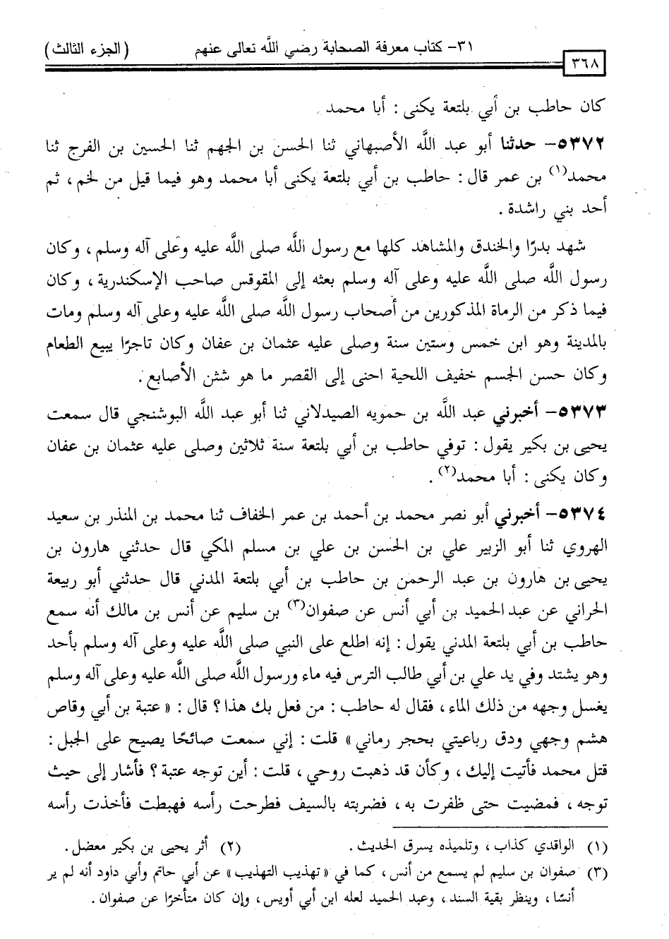 5373 - أَخْبَرَنِي عَبْدُ اللَّهِ بْنُ حَمُّويَهِ الصَّيْدَلَانِيُّ * ، ثَنَا أَبُو عَبْدِ اللَّهِ الْبُوشَنْجِيُّ ، قَالَ: سَمِعْتُ يَحْيَى بْنَ بُكَيْرٍ يَقُولُ: " تُوُفِّيَ حَاطِبُ بْنُ أَبِي بَلْتَعَةَ سَنَةَ ثَلَاثِينَ وَصَلَّى عَلَيْهِ عُثْمَانُ بْنُ عَفَّانَ ، وَكَانَ يُكَنَّى أَبَا مُحَمَّدٍ "
