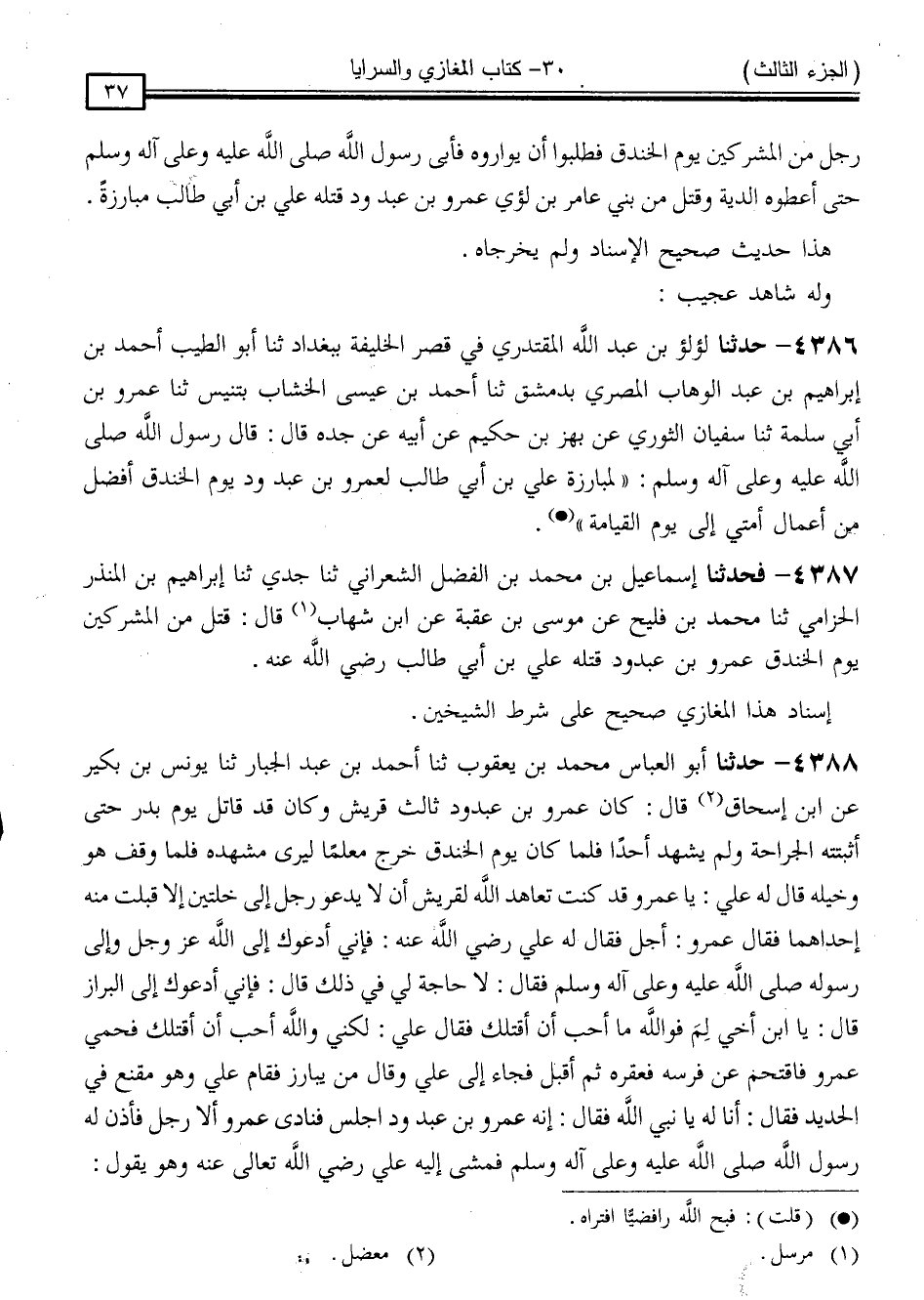 4388 - حَدَّثَنَا أَبُو الْعَبَّاسِ مُحَمَّدُ بْنُ يَعْقُوبَ ، ثنا أَحْمَدُ بْنُ عَبْدِ الْجَبَّارِ ، ثنا يُونُسُ بْنُ بُكَيْرٍ ، عَنِ ابْنِ إِسْحَاقَ ، قَالَ: كَانَ عَمْرُو بْنُ عَبْدِ وُدٍّ ثَالِثَ قُرَيْشٍ ، وَكَانَ قَدْ قَاتَلَ يَوْمَ بَدْرٍ حَتَّى أَثْبَتَتْهُ الْجِرَاحَةُ ، وَلَمْ يَشْهَدْ أُحُدًا ، فَلَمَّا كَانَ يَوْمُ الْخَنْدَقِ خَرَجَ مُعْلِمًا لَيَرَى مَشْهَدَهُ ، فَلَمَّا وَقَفَ هُوَ وَخَيْلُهُ قَالَ لَهُ عَلِيُّ: يَا عَمْرُو قَدْ كُنْتَ تُعَاهِدُ اللَّهَ لِقُرَيْشٍ أَنْ لَا يَدْعُوَ رَجُلٌ إِلَى خَلَّتَيْنِ إِلَّا قَبِلْتَ مِنْهُ أَحَدَهُمَا ، فَقَالَ عَمْرٌو: أَجَلْ ، فَقَالَ لَهُ عَلِيٌّ رَضِيَ اللَّهُ عَنْهُ: فَإِنِّي أَدْعُوكَ إِلَى اللَّهِ عَزَّ وَجَلَّ وَإِلَى رَسُولِهِ صَلَّى اللَّهُ عَلَيْهِ وَسَلَّمَ وَالْإِسْلَامِ ، فَقَالَ: لَا حَاجَةَ لِي فِي ذَلِكَ ، قَالَ: فَإِنِّي أَدْعُوكَ إِلَى الْبَرَازِ ، قَالَ: يَا ابْنَ أَخِي ، لِمَ ؟ فَوَاللَّهِ مَا أُحِبُّ أَنْ أَقَتُلَكَ ، فَقَالَ عَلِيٌّ: لَكِنِّي أُحِبُّ أَنْ أَقَتُلَكَ ، فَحَمِيَ عَمْرٌو فَاقْتَحَمَ عَنْ فَرَسِهِ فَعَقَرَهُ ، ثُمَّ أَقْبَلَ فَجَاءَ إِلَى عَلِيٍّ ، وَقَالَ: مَنْ يُبَارِزُ ؟ فَقَامَ عَلِيٌّ وَهُوَ مُقَنَّعٌ فِي الْحَدِيدِ ، فَقَالَ: أَنَا لَهُ يَا نَبِيَّ اللَّهِ ، فَقَالَ: إِنَّهُ عَمْرُو بْنُ عَبْدِ وُدٍّ اجْلِسْ ، فَنَادَى عَمْرٌو: أَلَا رَجُلٌ ؟ " فَأَذِنَ لَهُ رَسُولُ اللَّهِ صَلَّى اللَّهُ عَلَيْهِ وَسَلَّمَ " فَمَشَى إِلَيْهِ عَلِيٌّ رَضِيَ اللَّهُ عَنْهُ وَهُوَ يَقُولُ: