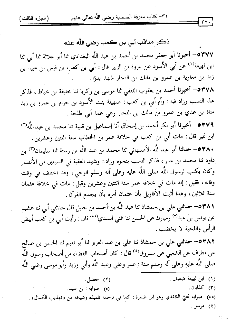5378 - أَخْبَرَنَا أَحْمَدُ بْنُ يَعْقُوبَ الثَّقَفِيُّ ، ثَنَا مُوسَى بْنُ زَكَرِيَّا ، ثَنَا خَلِيفَةُ بْنُ خَيَّاطٍ ، " فَذَكَرَ هَذَا النَّسَبَ وَزَادَ فِيهِ وَأُمُّ أُبَيِّ بْنِ كَعْبٍ صُهَيْلَةُ بِنْتُ الْأَسْوَدِ بْنِ حَرَامِ بْنِ عَمْرِو بْنِ زَيْدِ مَنَاةَ بْنِ عَدِيِّ بْنِ عَمْرِو بْنِ مَالِكِ بْنِ النَّجَّارِ ، وَهِيَ عَمَّةُ أَبِي طَلْحَةَ "