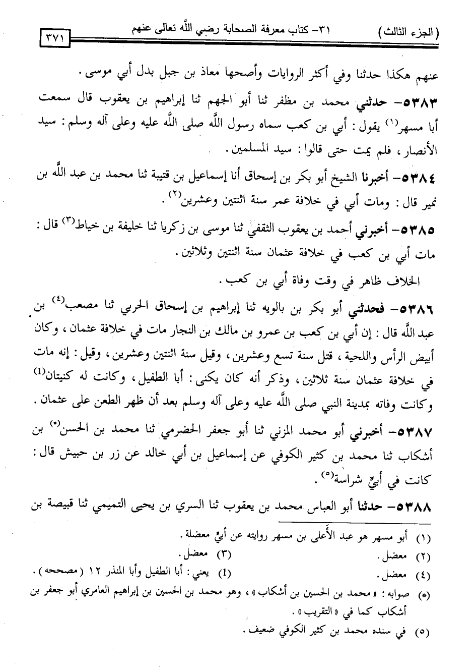 5386 - فَحَدَّثَنِي أَبُو بَكْرِ بْنُ بَالَوَيْهِ ، ثَنَا إِبْرَاهِيمُ بْنُ إِسْحَاقَ الْحَرْبِيُّ ، ثَنَا مُصْعَبُ بْنُ عَبْدِ اللَّهِ ، قَالَ: " إِنَّ أُبَيَّ بْنَ كَعْبِ بْنِ عَمْرِو بْنِ مَالِكِ بْنِ النَّجَّارِ مَاتَ فِي خِلَافَةِ عُثْمَانَ وَكَانَ أَبْيَضَ الرَّأْسِ وَاللِّحْيَةِ ، قُتِلَ سَنَةَ تِسْعٍ وَعِشْرِينَ وَقِيلَ سَنَةَ اثْنَتَيْنِ وَعِشْرِينَ ، وَقِيلَ أَنَّهُ مَاتَ فِي خِلَافَةِ عُثْمَانَ سَنَةَ ثَلَاثِينَ وَذُكِرَ أَنَّهُ كَانَ يُكَنَّى أَبَا الطُّفَيْلِ وَكَانَتْ لَهُ كُنْيَتَانِ ، وَكَانَتْ وَفَاتُهُ بِمَدِينَةِ النَّبِيِّ صَلَّى اللَّهُ عَلَيْهِ وَسَلَّمَ بَعْدَ أَنْ ظَهَرَ الطَّعْنُ عَلَى عُثْمَانَ "