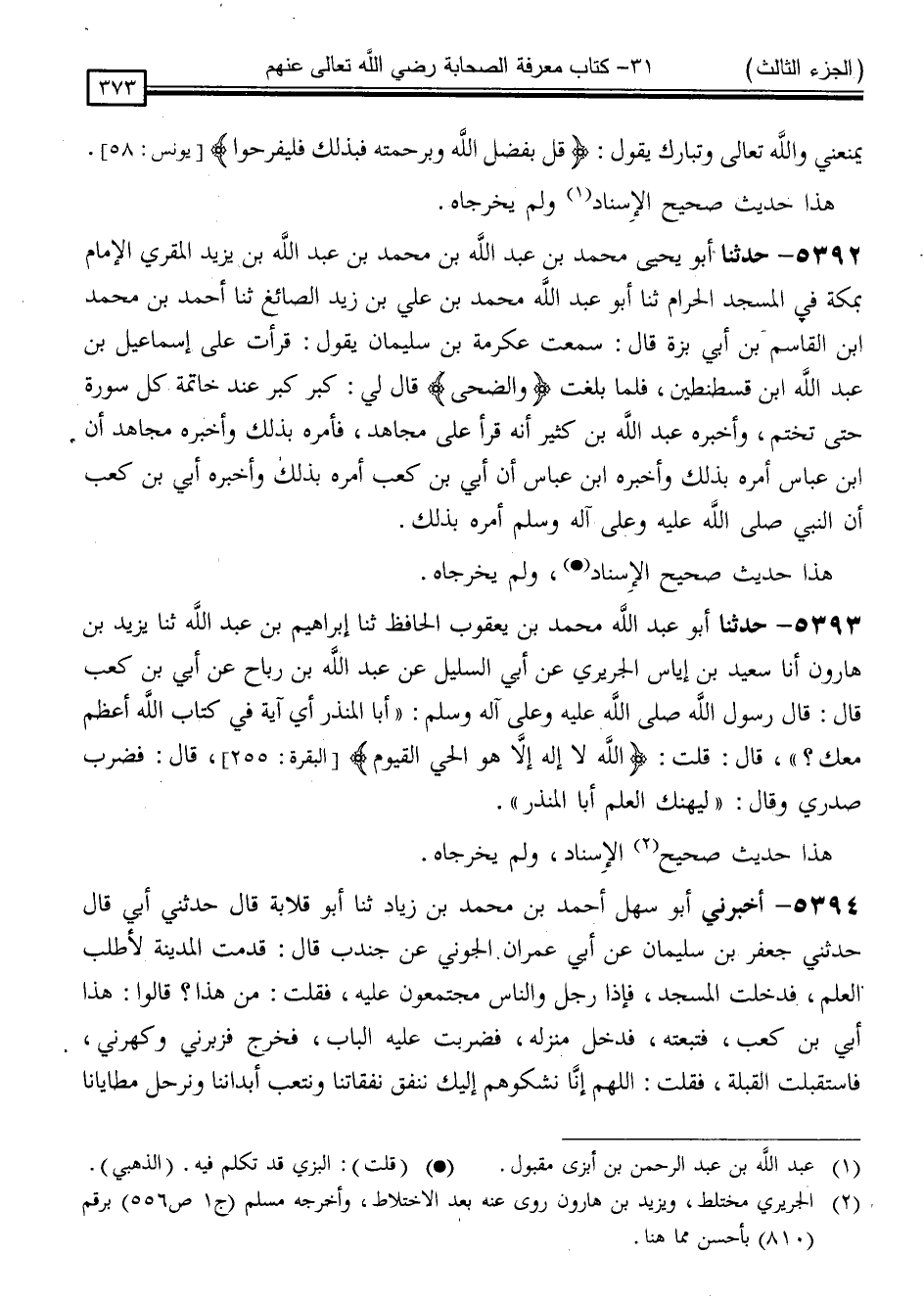 5393 - حَدَّثَنَا أَبُو عَبْدِ اللَّهِ مُحَمَّدُ بْنُ يَعْقُوبَ الْحَافِظُ ، ثَنَا إِبْرَاهِيمُ بْنُ عَبْدِ اللَّهِ ، ثَنَا يَزِيدُ بْنُ هَارُونَ ، أَنَا سَعِيدُ بْنُ إِيَاسٍ الْجُرَيْرِيُّ ، عَنْ أَبِي السَّلِيلِ ، عَنْ عَبْدِ اللَّهِ بْنِ رَبَاحٍ ، عَنْ أُبَيِّ بْنِ كَعْبٍ ، قَالَ: قَالَ رَسُولُ اللَّهِ صَلَّى اللَّهُ عَلَيْهِ وَسَلَّمَ: " أَبَا الْمُنْذِرِ ، أَيُّ آيَةٍ فِي كِتَابِ اللَّهِ أَعْظَمَ مَعَكَ ؟ " قَالَ: قُلْتُ: { اللَّهُ لَا إِلَهَ إِلَّا هُوَ الْحَيُّ الْقَيُّومُ } [البقرة: 255] قَالَ: فَضَرَبَ صَدْرِي وَقَالَ: " لِيَهْنِكَ الْعِلْمُ أَبَا الْمُنْذِرِ "