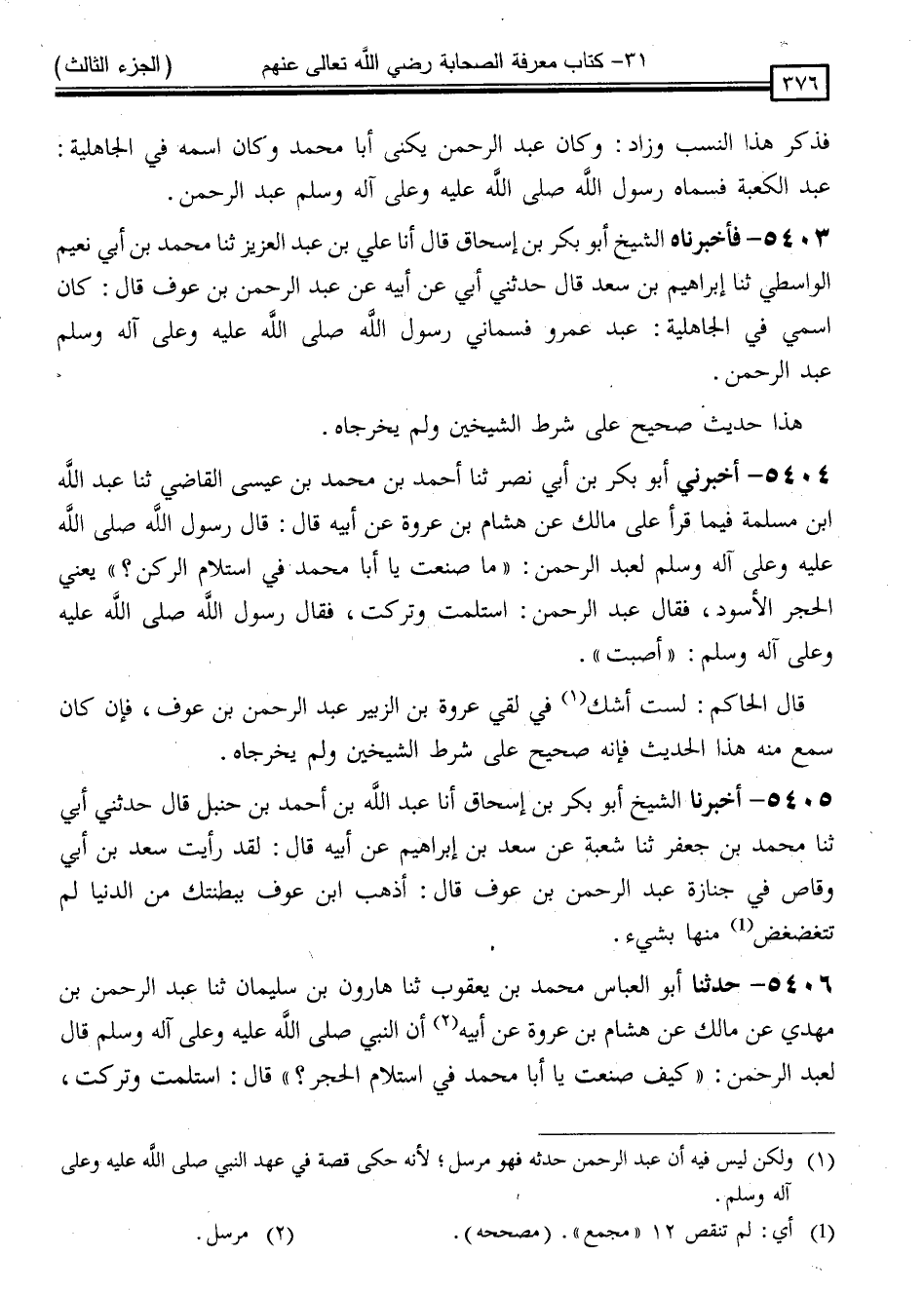 5406 - حَدَّثَنَا أَبُو الْعَبَّاسِ مُحَمَّدُ بْنُ يَعْقُوبَ ، ثَنَا هَارُونُ بْنُ سُلَيْمَانَ ، ثَنَا عَبْدُ الرَّحْمَنِ بْنُ مَهْدِيٍّ ، عَنْ مَالِكٍ ، عَنْ هِشَامِ بْنِ عُرْوَةَ ، عَنْ أَبِيهِ ، أَنَّ النَّبِيَّ صَلَّى اللَّهُ عَلَيْهِ وَسَلَّمَ قَالَ لِعَبْدِ الرَّحْمَنِ: " كَيْفَ صَنَعْتَ يَا أَبَا مُحَمَّدٍ فِي اسْتِلَامِ الْحَجَرِ ؟ " قَالَ: اسْتَلَمْتُ وَتَرَكْتُ ، -[377]- قَالَ: " أَصَبْتَ يَا أَبَا مُحَمَّدٍ "