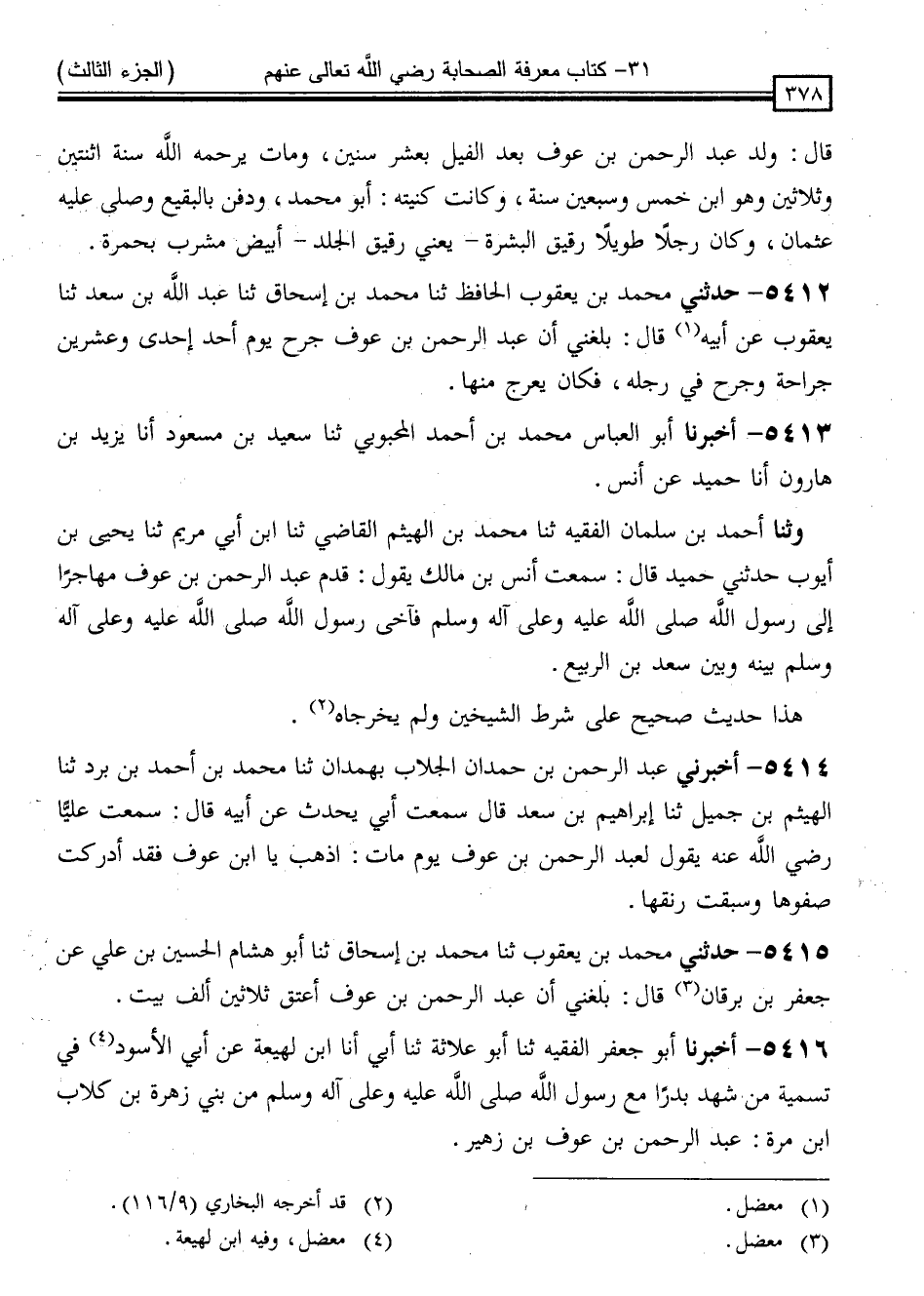 5412 - حَدَّثَنِي مُحَمَّدُ بْنُ يَعْقُوبَ الْحَافِظُ ، ثَنَا مُحَمَّدُ بْنُ إِسْحَاقَ ، ثَنَا عُبيْدُ اللَّهِ بْنُ سَعْدٍ ، ثَنَا يَعْقُوبُ ، عَنْ أَبِيهِ ، قَالَ: بَلَغَنِي أَنَّ عَبْدَ الرَّحْمَنِ بْنَ عَوْفٍ جُرِحَ يَوْمَ أُحُدٍ إِحْدَى وَعِشْرِينَ جِرَاحَةً ، وَجُرِحَ فِي رِجْلِهِ ، فَكَانَ يَعْرُجُ مِنْهَا "