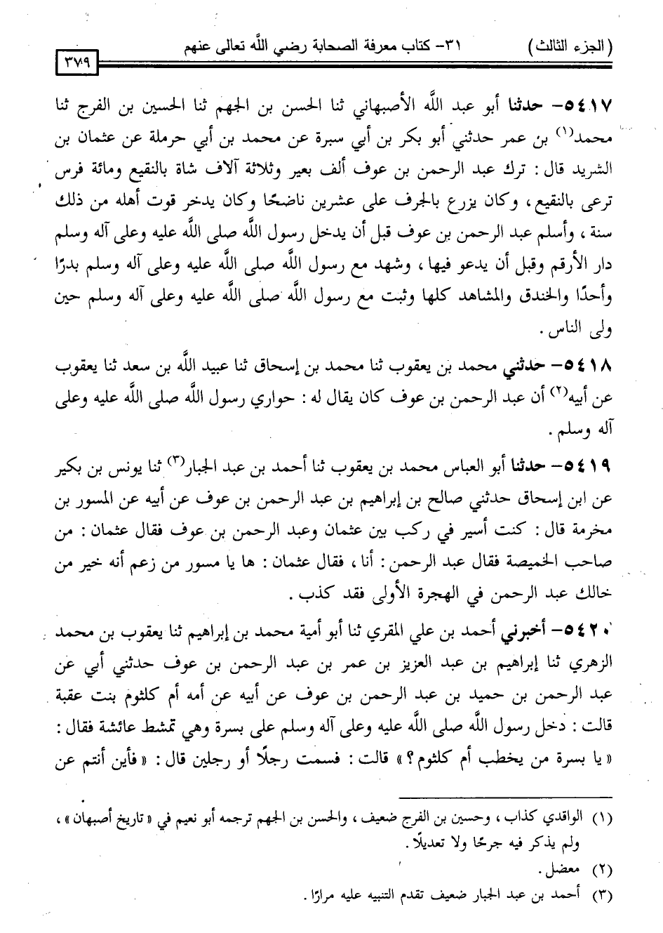5417 - حَدَّثَنَا أَبُو عَبْدِ اللَّهِ الْأَصْبَهَانِيُّ ، ثَنَا الْحَسَنُ بْنُ الْجَهْمِ ، ثَنَا الْحُسَيْنُ بْنُ الْفَرَجِ ، ثَنَا مُحَمَّدُ بْنُ عُمَرَ ، حَدَّثَنِي أَبُو بَكْرِ بْنُ أَبِي سَبْرَةَ ، عَنْ مُحَمَّدِ بْنِ أَبِي حَرْمَلَةَ ، عَنْ عُثْمَانَ بْنِ الشَّرِيدِ قَالَ: " تَرَكَ عَبْدُ الرَّحْمَنِ بْنُ عَوْفٍ أَلْفَ بَعِيرٍ وَثَلَاثَةَ آلَافِ شَاةٍ بِالنَّقِيعِ ، وَمِائَةَ فَرَسٍ تَرْعَى بِالنَّقِيعِ ، وَكَانَ يَزْرَعُ بِالْجُرُفِ عَلَى عِشْرِينَ نَاضِحًا ، وَكَانَ يَدَّخِرُ قُوتَ أَهْلِهِ مِنْ ذَلِكَ سَنَةً ، وَأَسْلَمَ عَبْدُ الرَّحْمَنِ بْنُ عَوْفٍ قَبْلَ أَنْ يَدْخُلَ رَسُولُ اللَّهِ صَلَّى اللَّهُ عَلَيْهِ وَسَلَّمَ دَارَ الْأَرْقَمِ ، وَقَبْلَ أَنْ يَدْعُوَ فِيهَا ، وَشَهِدَ مَعَ رَسُولِ اللَّهِ صَلَّى اللَّهُ عَلَيْهِ وَسَلَّمَ بَدْرًا ، وَأُحُدًا ، وَالْخَنْدَقَ وَالْمَشَاهِدَ كُلَّهَا ، وَثَبَتَ مَعَ رَسُولِ اللَّهِ صَلَّى اللَّهُ عَلَيْهِ وَسَلَّمَ حِينَ وَلَّى النَّاسُ "
