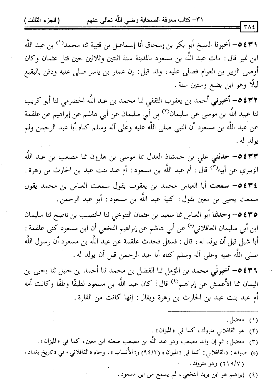 5434 - سَمِعْتُ أَبَا الْعَبَّاسِ مُحَمَّدَ بْنَ يَعْقُوبَ ، يَقُولُ: سَمِعْتُ الْعَبَّاسَ بْنَ مُحَمَّدٍ يَقُولُ: سَمِعْتُ يَحْيَى بْنَ مَعِينٍ يَقُولُ: " كُنْيَةُ عَبْدِ اللَّهِ بْنُ مَسْعُودٍ أَبُو عَبْدِ الرَّحْمَنِ
