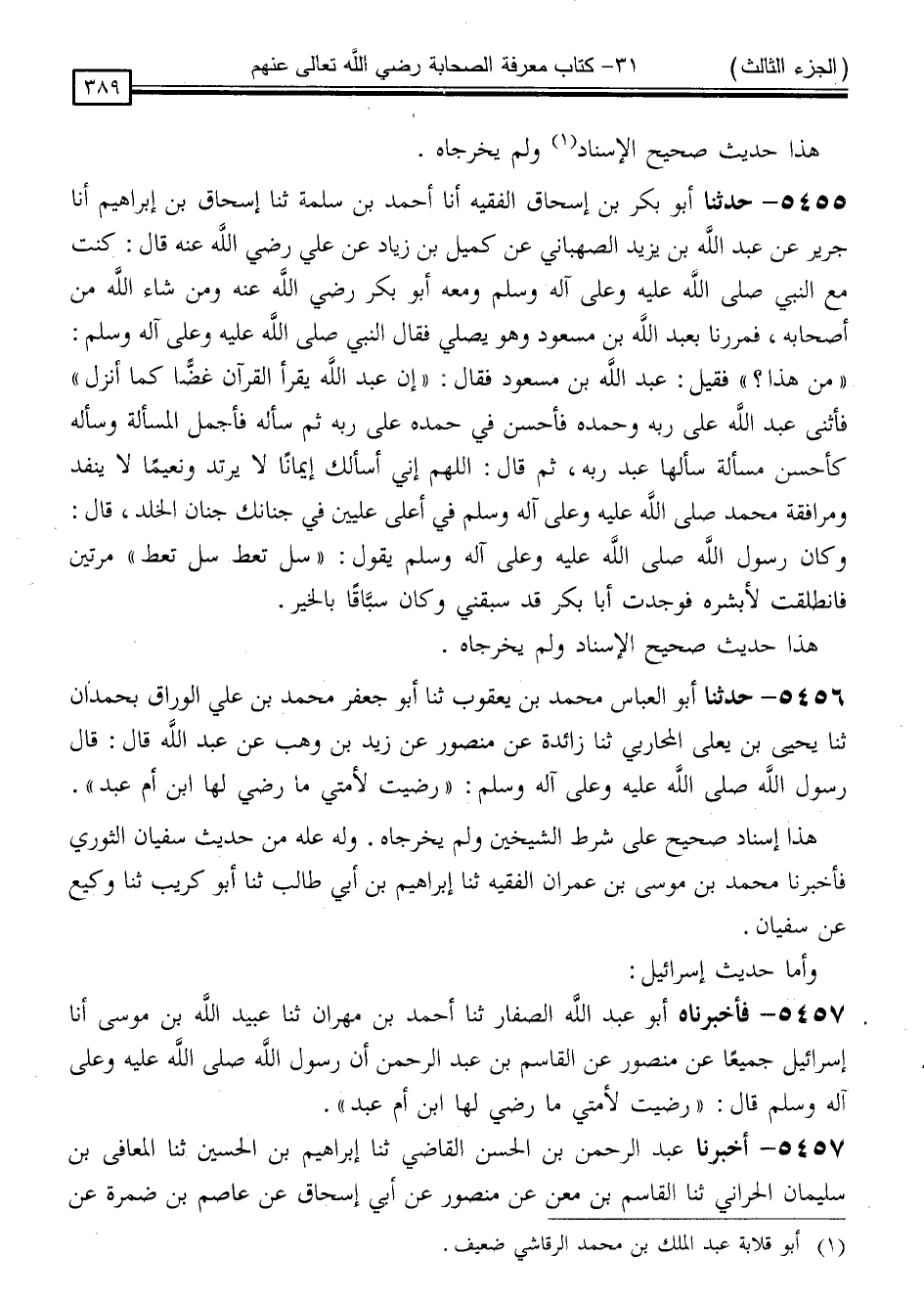 5457 - فَأَخْبَرَنَاهُ أَبُو عَبْدِ اللَّهِ الصَّفَّارُ ، ثَنَا أَحْمَدُ بْنُ مِهْرَانَ ، ثَنَا عُبَيْدُ اللَّهِ بْنُ مُوسَى ، أَنَا إِسْرَائِيلُ ، جَمِيعًا ، عَنْ مَنْصُورٍ ، عَنِ الْقَاسِمِ بْنِ عَبْدِ الرَّحْمَنِ ، أَنَّ رَسُولَ اللَّهِ صَلَّى اللَّهُ عَلَيْهِ وَسَلَّمَ قَالَ: " رَضِيتُ لِأُمَّتِي مَا رَضِيَ لَهَا ابْنُ أُمِّ عَبْدٍ "