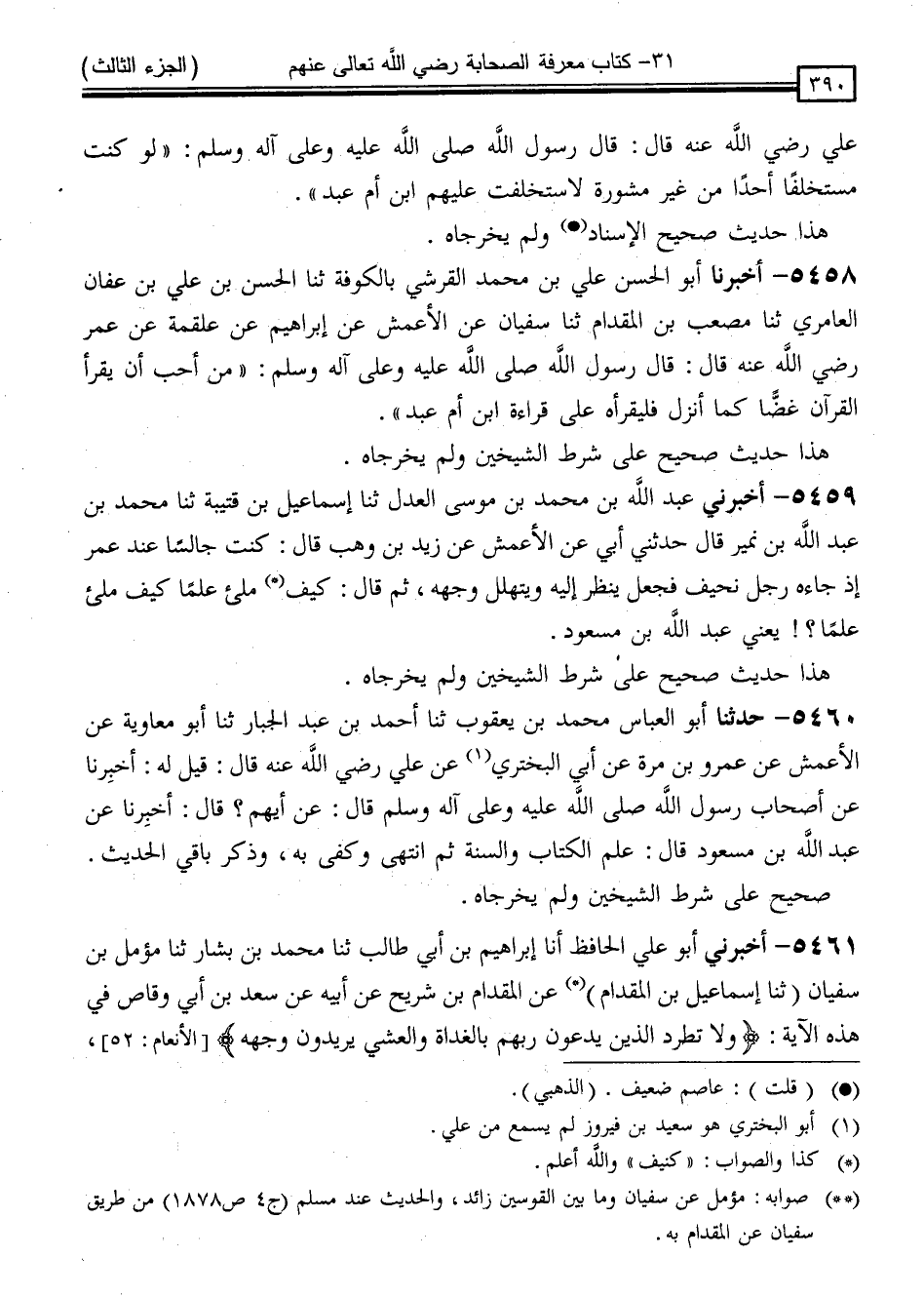 5460 - حَدَّثَنَا أَبُو الْعَبَّاسِ مُحَمَّدُ بْنُ يَعْقُوبَ ، ثَنَا أَحْمَدُ بْنُ عَبْدِ الْجَبَّارِ ، ثَنَا أَبُو مُعَاوِيَةَ ، عَنِ الْأَعْمَشِ ، عَنْ عَمْرِو بْنِ مُرَّةَ ، عَنْ أَبِي الْبَخْتَرِيِّ ، عَنْ عَلِيِّ رَضِيَ اللَّهُ عَنْهُ قَالَ: قِيلَ لَهُ: أَخْبِرْنَا عَنْ أَصْحَابِ رَسُولِ اللَّهِ صَلَّى اللَّهُ عَلَيْهِ وَسَلَّمَ ، قَالَ: " عَنْ أَيُّهُمْ ؟ " قَالَ: أَخْبِرْنَا عَنْ عَبْدِ اللَّهِ بْنِ مَسْعُودٍ ، قَالَ: " عَلِمَ الْكِتَابَ وَالسُّنَةَ ، ثُمَّ انْتَهَى وَكَفَى بِهِ " وَذِكْرُ بَاقِي الْحَدِيثِ " صَحِيحٌ عَلَى شَرْطِ الشَّيْخَيْنِ ، وَلَمْ يُخَرِّجَاهُ "