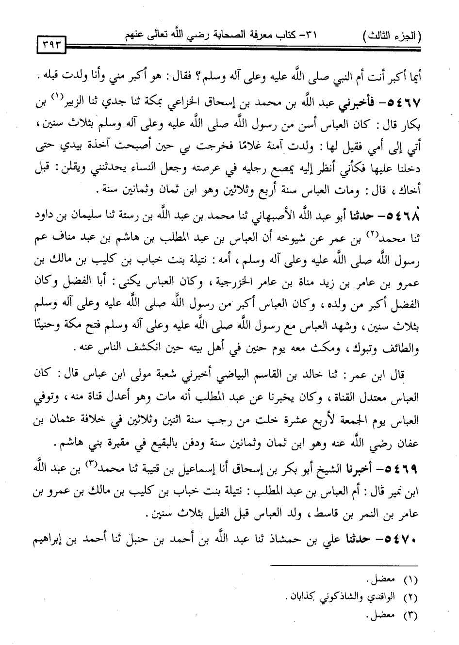 5468 - حَدَّثَنَا أَبُو عَبْدِ اللَّهِ الْأَصْبَهَانِيُّ ، ثَنَا مُحَمَّدُ بْنُ عَبْدِ اللَّهِ بْنِ رُسْتَةَ ، ثَنَا سُلَيْمَانُ بْنُ دَاوُدَ ، ثَنَا مُحَمَّدُ بْنُ عُمَرَ ، عَنْ شُيُوخِهِ ، " أَنَّ الْعَبَّاسَ بْنَ عَبْدِ الْمُطَّلِبِ بْنِ هَاشِمِ بْنِ عَبْدِ مَنَافٍ عَمَّ رَسُولِ اللَّهِ صَلَّى اللَّهُ عَلَيْهِ وَسَلَّمَ ، أُمُّهُ: نُتَيْلَةُ بِنْتُ خَبَّابِ بْنِ كُلَيْبِ بْنِ مَالِكِ بْنِ عَمْرِو بْنِ عَامِرِ بْنِ زَيْدِ مَنَاةَ بْنِ عَامِرٍ الْخَزْرَجِيِّةُ ، وَكَانَ الْعَبَّاسُ يُكَنَّى أَبَا الْفَضْلِ وَكَانَ الْفَضْلُ أَكْبَرَ مَنْ وَلَدِهِ ، وَكَانَ الْعَبَّاسُ أَكْبَرَ مِنْ رَسُولِ اللَّهِ صَلَّى اللَّهُ عَلَيْهِ وَسَلَّمَ بِثَلَاثِ سِنِينَ ، وَشَهِدَ الْعَبَّاسُ مَعَ رَسُولِ اللَّهِ صَلَّى اللَّهُ عَلَيْهِ وَسَلَّمَ فَتْحَ مَكَّةَ ، وَحُنَيْنًا ، وَالطَّائِفَ ، وَتَبُوكَ ، وَمَكَثَ مَعَهُ يَوْمَ حُنَيْنٍ فِي أَهْلِ بَيْتِهِ حِينَ انْكَشَفَ النَّاسُ عَنْهُ "