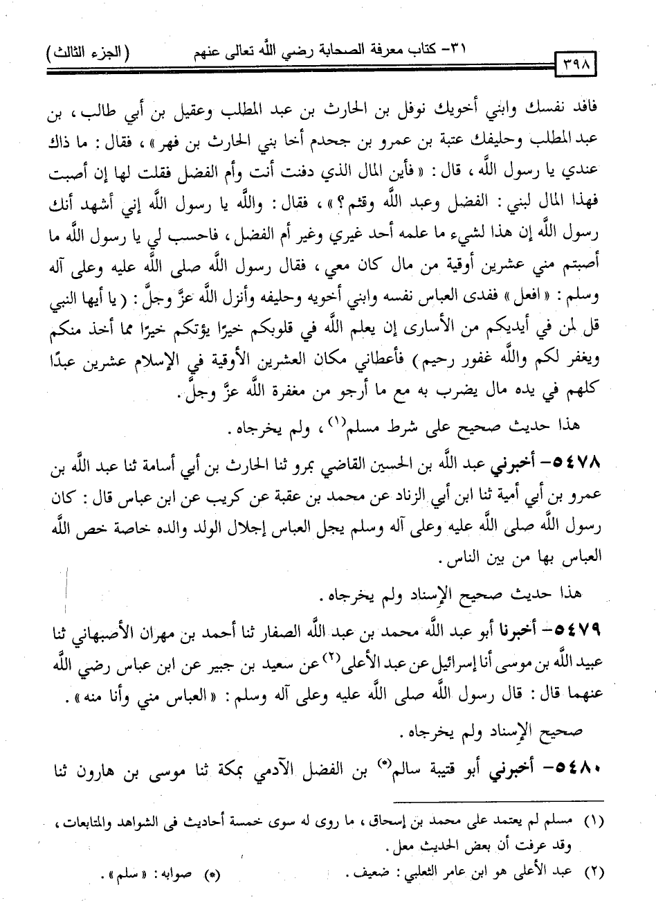 5479 - أَخْبَرَنَا أَبُو عَبْدِ اللَّهِ مُحَمَّدُ بْنُ عَبْدِ اللَّهِ الصَّفَّارُ ، ثَنَا أَحْمَدُ بْنُ مِهْرَانَ الْأَصْبَهَانِيُّ ، ثَنَا عُبَيْدُ اللَّهِ بْنُ مُوسَى ، أَنَا إِسْرَائِيلُ ، عَنْ عَبْدِ الْأَعْلَى ، عَنْ سَعِيدِ بْنِ جُبَيْرٍ ، عَنِ ابْنِ عَبَّاسٍ رَضِيَ اللَّهُ عَنْهُمَا قَالَ: قَالَ رَسُولُ اللَّهِ صَلَّى اللَّهُ عَلَيْهِ وَسَلَّمَ: " الْعَبَّاسُ مِنِّي وَأَنَا مِنْهُ "