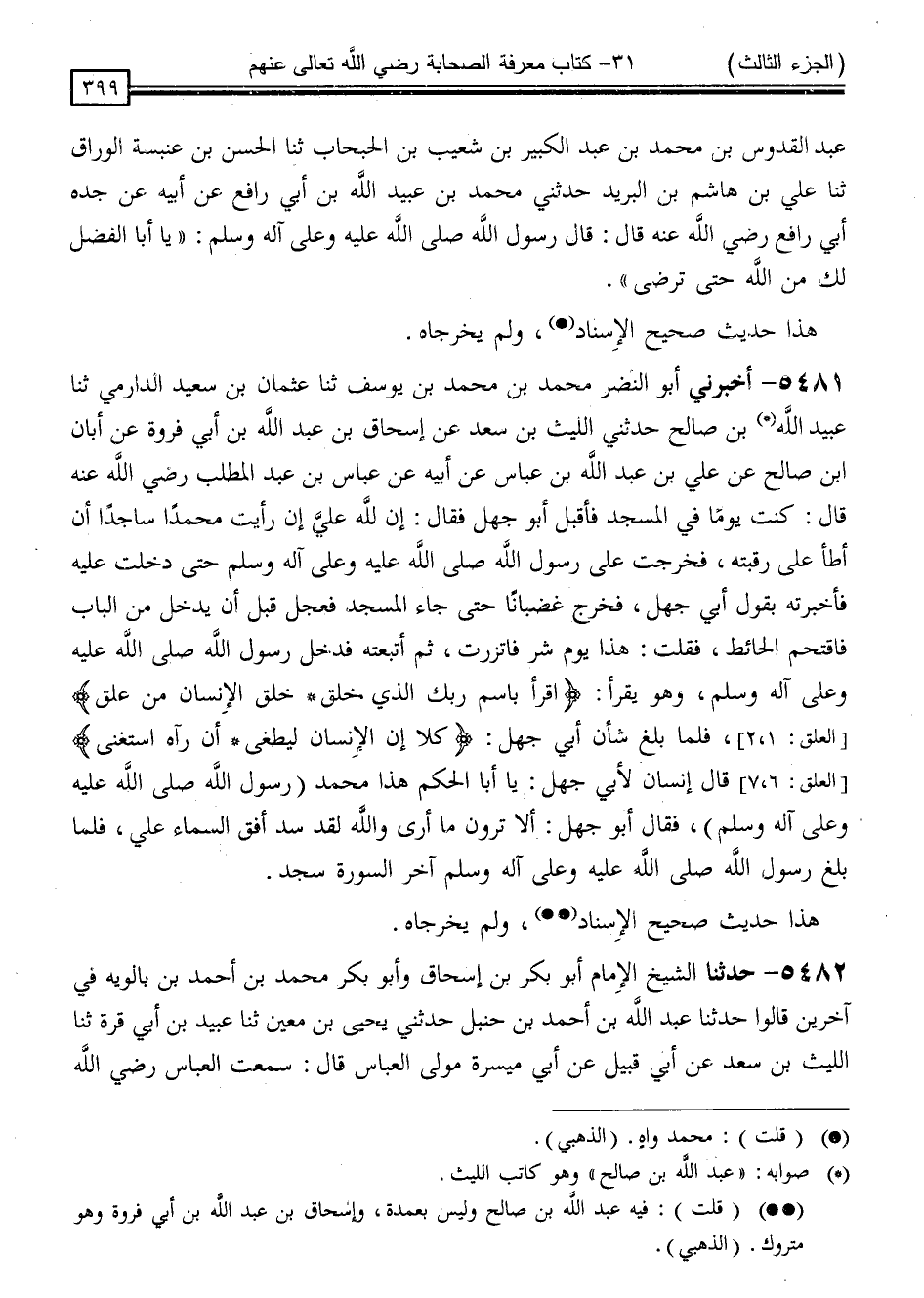 5481 - أَخْبَرَنِي أَبُو النَّضْرِ مُحَمَّدُ بْنُ مُحَمَّدِ بْنِ يُوسُفَ ، ثَنَا عُثْمَانُ بْنُ سَعِيدٍ الدَّارِمِيُّ ، ثَنَا عُبَيْدُ اللَّهِ بْنُ صَالِحٍ ، حَدَّثَنِي اللَّيْثُ بْنُ سَعْدٍ ، عَنْ إِسْحَاقَ بْنِ عَبْدِ اللَّهِ بْنِ أَبِي فَرْوَةَ ، عَنْ أَبَانَ بْنِ صَالِحٍ ، عَنْ عَلِيِّ بْنِ عَبْدِ اللَّهِ بْنِ عَبَّاسٍ ، عَنْ أَبِيهِ ، عَنْ عَبَّاسِ بْنِ عَبْدِ الْمُطَّلِبِ رَضِيَ اللَّهُ عَنْهُ قَالَ: كُنْتُ يَوْمًا فِي الْمَسْجِدِ ، فَأَقْبَلَ أَبُو جَهْلٍ فَقَالَ: إِنَّ لِلَّهِ عَلَيَّ إِنْ رَأَيْتُ مُحَمَّدًا سَاجِدًا أَنْ أَطَأَ عَلَى رَقَبَتِهِ ، " فَخَرَجْتُ عَلَى رَسُولِ اللَّهِ صَلَّى اللَّهُ عَلَيْهِ وَسَلَّمَ حَتَّى دَخَلْتُ عَلَيْهِ فَأَخْبَرْتُهُ بِقَوْلِ أَبِي جَهْلٍ ، فَخَرَجَ غَضْبَانًا حَتَّى جَاءَ الْمَسْجِدَ " ، فَعَجَّلَ قَبْلَ أَنْ يَدْخُلَ مِنَ الْبَابِ فَاقْتَحَمَ الْحَائِطَ ، فَقُلْتُ: هَذَا يَوْمُ شَرٍّ ، فَاتَّزَرْتُ ، ثُمَّ اتَّبَعْتُهُ فَدَخَلَ رَسُولُ اللَّهِ صَلَّى اللَّهُ عَلَيْهِ وَسَلَّمَ وَهُوَ يَقْرَأُ: اقْرَأْ بِاسْمِ رَبِّكَ الَّذِي خَلَقَ خَلَقَ الْإِنْسَانَ مِنْ عَلَقٍ ، فَلَمَّا بَلَغَ شَأْنَ أَبِي جَهْلٍ: { كَلَّا إِنَّ الْإِنْسَانَ لَيَطْغَى أَنْ رَآهُ اسْتَغْنَى } [العلق: 7] ، قَالَ إِنْسَانٌ لِأَبِي جَهْلٍ: يَا أَبَا الْحَكَمِ ، هَذَا مُحَمَّدٌ رَسُولُ اللَّهِ صَلَّى اللَّهُ عَلَيْهِ وَسَلَّمَ ، فَقَالَ أَبُو جَهْلٍ: أَلَا تَرَوْنَ مَا أَرَى ، وَاللَّهِ لَقَدْ سَدَّ أُفُقَ السَّمَاءِ عَلَيَّ ، " فَلَمَّا بَلَغَ رَسُولُ اللَّهِ صَلَّى اللَّهُ عَلَيْهِ وَسَلَّمَ آخِرَ السُّورَةِ سَجَدَ "