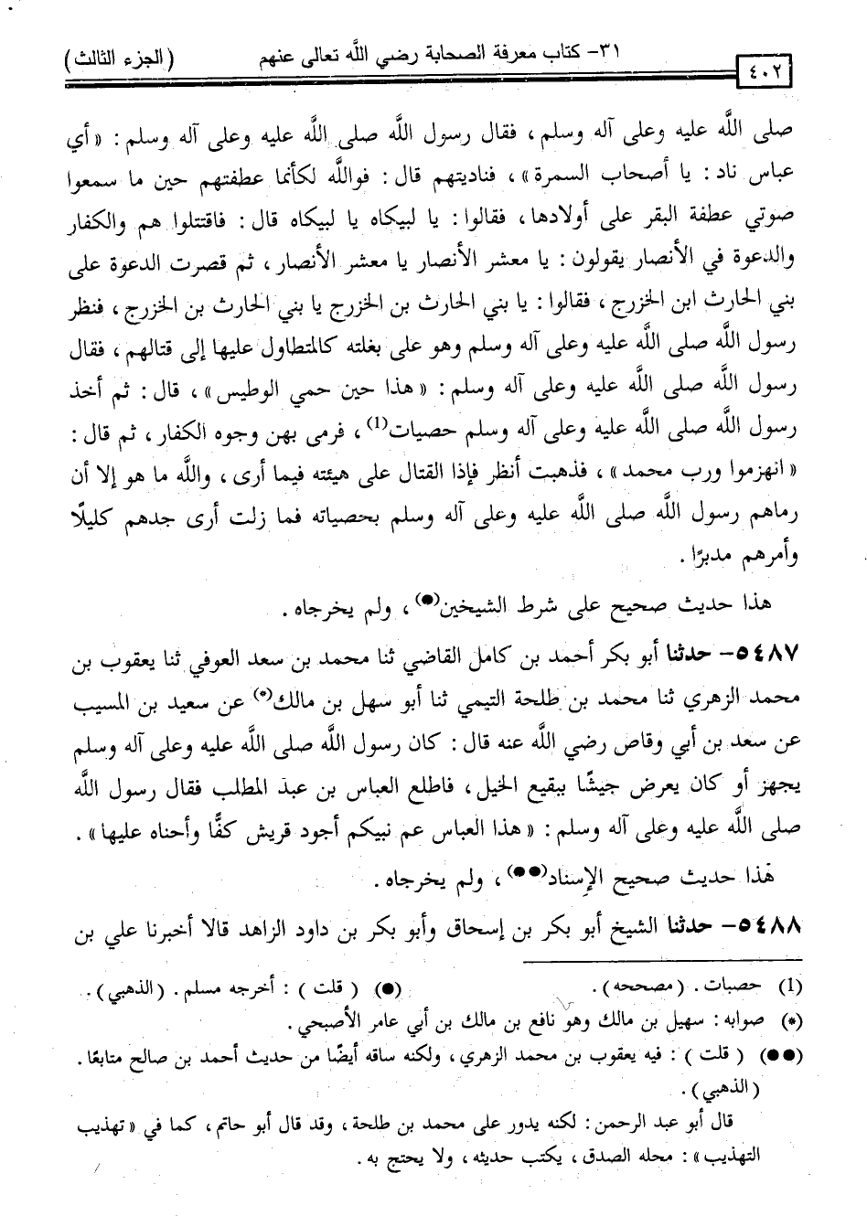 5487 - حَدَّثَنَا أَبُو بَكْرٍ أَحْمَدُ بْنُ كَامِلٍ الْقَاضِي ، ثَنَا مُحَمَّدُ بْنُ سَعْدٍ الْعَوْفِيُّ ، ثَنَا يَعْقُوبُ بْنُ مُحَمَّدٍ الزُّهْرِيُّ ، ثَنَا مُحَمَّدُ بْنُ طَلْحَةَ التَّيْمِيُّ ، ثَنَا أَبُو سُهَيْلِ بْنُ مَالِكٍ ، عَنْ سَعِيدِ بْنِ الْمُسَيِّبِ ، عَنْ سَعْدِ بْنِ أَبِي وَقَّاصٍ رَضِيَ اللَّهُ عَنْهُ قَالَ: كَانَ رَسُولُ اللَّهِ صَلَّى اللَّهُ عَلَيْهِ وَسَلَّمَ يُجَهِّزُ أَوْ كَانَ يَعْرِضُ جَيْشًا بِبَقِيعِ الْخَيْلِ فَاطَّلَعَ الْعَبَّاسُ بْنُ عَبْدِ الْمُطَّلِبِ ، فَقَالَ رَسُولُ اللَّهِ صَلَّى اللَّهُ عَلَيْهِ وَسَلَّمَ: " هَذَا الْعَبَّاسُ عَمُّ نَبِيِّكُمْ ، أَجْوَدُ قُرَيْشٍ كَفًّا وَأَحْنَاهُ عَلَيْهَا "