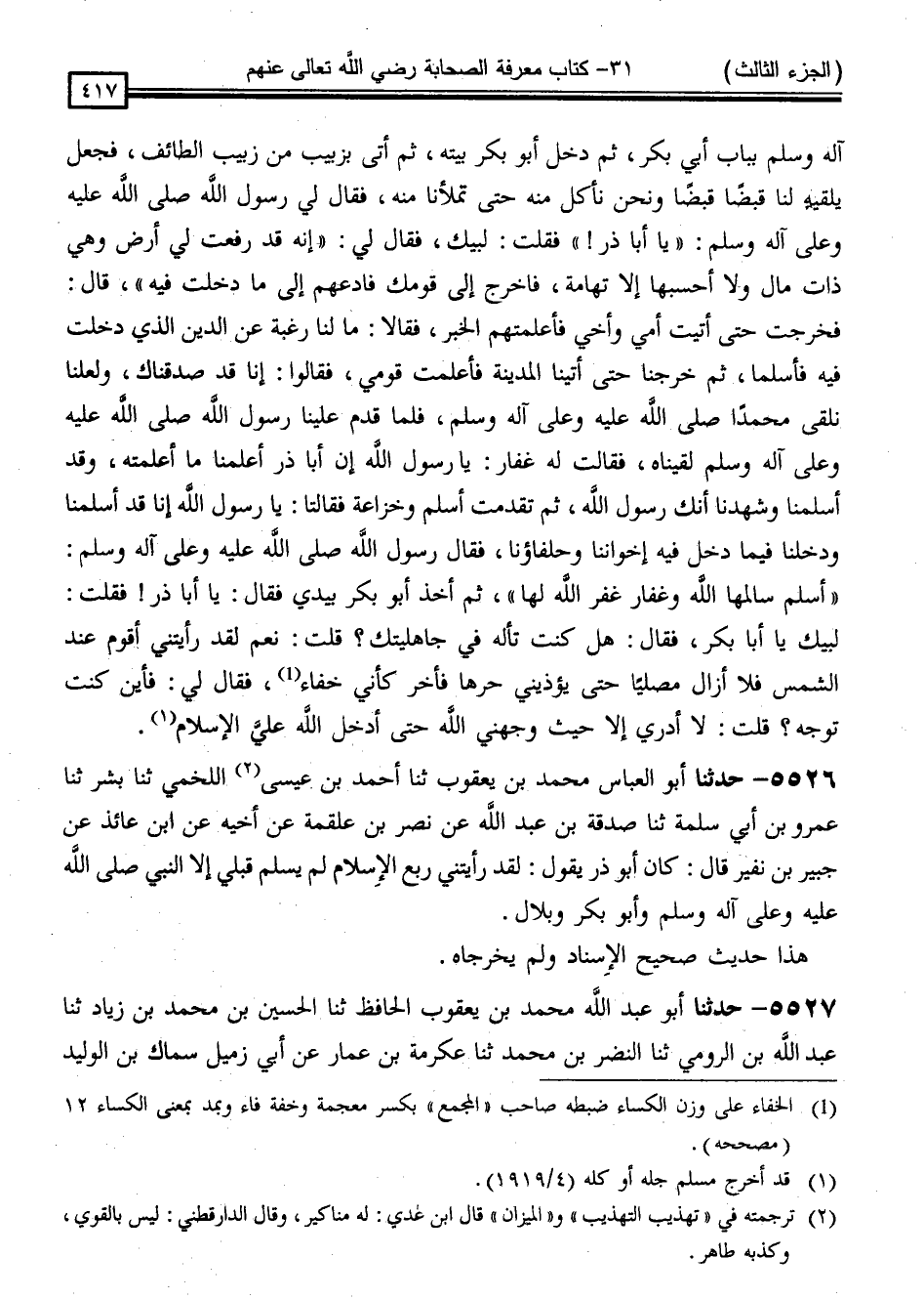 5527 - حَدَّثَنَا أَبُو عَبْدِ اللَّهِ مُحَمَّدُ بْنُ يَعْقُوبَ الْحَافِظُ ، ثَنَا الْحُسَيْنُ بْنُ مُحَمَّدِ بْنِ زِيَادٍ ، ثَنَا عَبْدُ اللَّهِ بْنُ الرُّومِيُّ ، ثَنَا النَّضْرُ بْنُ مُحَمَّدٍ ، ثَنَا عِكْرِمَةُ بْنُ عَمَّارٍ ، عَنْ أَبِي زُمَيْلٍ سِمَاكِ بْنِ الْوَلِيدِ ، -[418]- عَنْ مَالِكِ بْنِ مَرْثَدٍ ، عَنْ أَبِيهِ ، عَنْ أَبِي ذَرٍّ قَالَ: " كُنْتُ رُبْعَ الْإِسْلَامِ أَسْلَمَ قَبْلِي ثَلَاثَةُ نَفَرٍ ، وَأَنَا الرَّابِعُ أَتَيْتُ النَّبِيَّ صَلَّى اللَّهُ عَلَيْهِ وَسَلَّمَ فَقُلْتُ: السَّلَامُ عَلَيْكُمْ يَا رَسُولَ اللَّهِ ، أَشْهَدُ أَنَّ لَا إِلَهَ إِلَّا اللَّهُ ، وَأَشْهَدُ أَنَّ مُحَمَّدًا عَبْدُهُ وَرَسُولُهُ فَرَأَيْتُ الِاسْتِبْشَارَ فِي وَجْهِ رَسُولِ اللَّهِ صَلَّى اللَّهُ عَلَيْهِ وَسَلَّمَ "