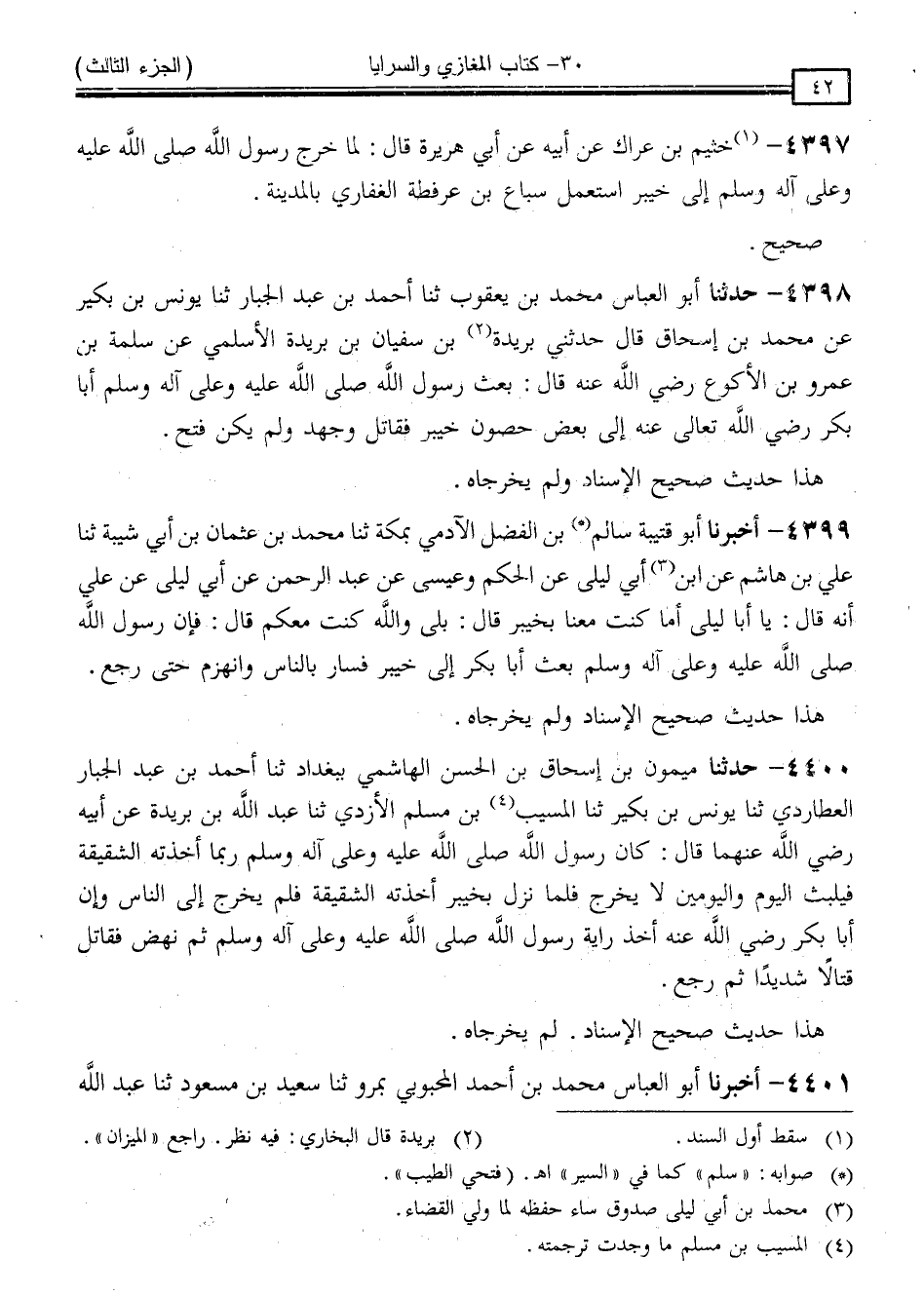 4401 - أَخْبَرَنَا أَبُو الْعَبَّاسِ مُحَمَّدُ بْنُ أَحْمَدَ الْمَحْبُوبِيُّ ، بِمَرْوَ ، ثنا سَعِيدُ بْنُ مَسْعُودٍ ، ثنا عُبَيْدُ اللَّهِ -[43]- بْنُ مُوسَى ، ثنا نُعَيْمُ بْنُ حَكِيمٍ ، عَنْ أَبِي مُوسَى الْحَنَفِيِّ ، عَنْ عَلِيٍّ رَضِيَ اللَّهُ عَنْهُ قَالَ: " سَارَ النَّبِيُّ صَلَّى اللَّهُ عَلَيْهِ وَسَلَّمَ إِلَى خَيْبَرَ ، فَلَمَّا أَتَاهَا بَعَثَ عُمَرُ رَضِيَ اللَّهُ تَعَالَى عَنْهُ ، وَبَعَثَ مَعَهُ النَّاسَ إِلَى مَدِينَتِهِمْ أَوْ قَصْرِهِمْ ، فَقَاتَلُوهُمْ فَلَمْ يَلْبَثُوا أَنْ هَزَمُوا عُمَرَ وَأَصْحَابَهُ ، فَجَاءُوا يُجَبِّنُونَهُ وَيُجَبِّنُهُمْ فَسَارَ النَّبِيُّ صَلَّى اللَّهُ عَلَيْهِ وَسَلَّمَ " الْحَدِيثُ .