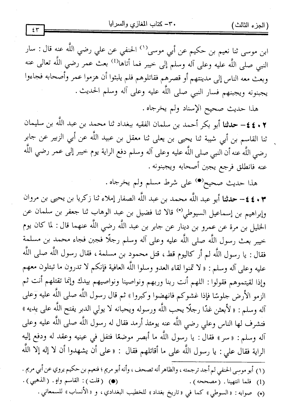4403 - حَدَّثَنَا أَبُو عَبْدِ اللَّهِ مُحَمَّدُ بْنُ عَبْدِ اللَّهِ الصَّفَّارُ ، إِمْلَاءً ، ثنا زَكَرِيَّا بْنُ يَحْيَى بْنُ مَرْوَانَ ، وَإِبْرَاهِيمُ بْنُ إِسْمَاعِيلَ السِّيُوطِيُّ ، قَالَا: ثنا فُضَيْلُ بْنُ عَبْدِ الْوَهَّابِ ، ثنا جَعْفَرُ بْنُ سُلَيْمَانَ ، عَنِ الْخَلِيلِ بْنِ مُرَّةَ ، عَنْ عَمْرِو بْنِ دِينَارٍ ، عَنْ جَابِرِ بْنِ عَبْدِ اللَّهِ ، رَضِيَ اللَّهُ عَنْهُمَا قَالَ: لَمَّا كَانَ يَوْمُ خَيْبَرَ بَعَثَ رَسُولُ اللَّهِ صَلَّى اللَّهُ عَلَيْهِ وَسَلَّمَ رَجُلًا فَجَبُنَ ، فَجَاءَ مُحَمَّدُ بْنُ مَسْلَمَةَ فَقَالَ: يَا رَسُولَ اللَّهِ ، لَمْ أَرَ كَالْيَوْمِ قَطُّ ، قُتِلَ مَحْمُودُ بْنُ مَسْلَمَةَ ، فَقَالَ رَسُولُ اللَّهِ: " لَا تَمَنَّوْا لِقَاءَ الْعَدُوِّ ، وَسَلُوا اللَّهَ الْعَافِيَةَ ، فَإِنَّكُمْ لَا تَدْرُونَ مَا تُبْتَلُونَ مَعَهُمْ ، وَإِذَا لَقِيتُمُوهُمْ ، فَقُولُوا: اللَّهُمَّ أَنْتَ رَبُّنَا وَرَبُّهُمْ ، وَنَوَاصِينَا وَنَوَاصِيهُمْ بِيَدِكَ ، وَإِنَّمَا تَقْتُلْهُمْ أَنْتَ ، ثُمَّ الْزَمُوا الْأَرْضَ جُلُوسًا ، فَإِذَا غَشُوكُمْ فَانْهَضُوا وَكَبِّرُوا " ثُمَّ قَالَ رَسُولُ اللَّهِ صَلَّى اللَّهُ عَلَيْهِ وَسَلَّمَ: " لَأَبْعَثَنَّ غَدًا رَجُلًا يُحِبُّ اللَّهَ وَرَسُولَهُ وَيُحِبَّانِهِ ، لَا يُوَلِّي الدُّبُرَ ، يَفْتَحُ اللَّهُ عَلَى يَدَيْهِ " فَتَشَرَّفَ لَهَا النَّاسُ ، وَعَلِيٌّ رَضِيَ اللَّهُ عَنْهُ يَوْمَئِذٍ أَرْمَدُ ، فَقَالَ لَهُ رَسُولُ اللَّهِ صَلَّى اللَّهُ عَلَيْهِ وَسَلَّمَ: " سِرْ " فَقَالَ: يَا رَسُولَ اللَّهِ ، مَا أُبْصِرُ مَوْضِعًا ، فَتَفَلَ فِي عَيْنَيْهِ ، وَعَقَدَ لَهُ وَدَفَعَ إِلَيْهِ الرَّايَةَ ، فَقَالَ عَلِيٌّ: يَا رَسُولَ اللَّهِ ، عَلَامَ أُقَاتِلُهُمْ ؟ فَقَالَ: " عَلَى أَنْ يَشْهَدُوا أَنَّ لَا إِلَهَ إِلَّا اللَّهُ ، -[44]- وَإِنِّي رَسُولُ اللَّهِ فَإِذَا فَعَلُوا ذَلِكَ فَقَدْ حَقَنُوا مِنِّي دِمَاءَهُمْ وَأَمْوَالَهُمْ إِلَّا بِحَقِّهِمَا ، وَحِسَابُهُمْ عَلَى اللَّهِ عَزَّ وَجَلَّ " ، قَالَ: فَلَقِيَهُمْ فَفَتَحَ اللَّهُ عَلَيْهِ