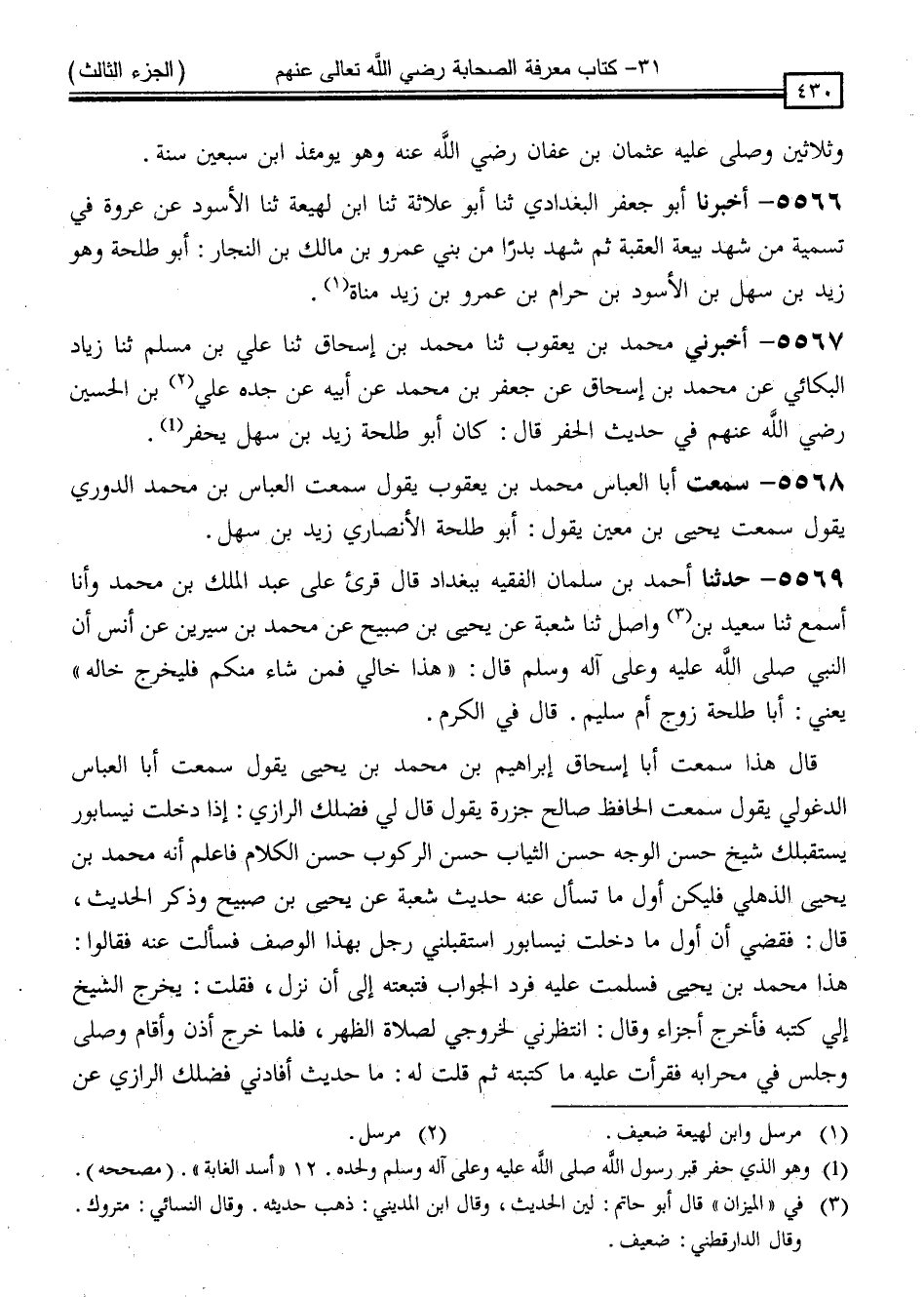 5568 - سَمِعْتُ أَبَا الْعَبَّاسِ مُحَمَّدَ بْنَ يَعْقُوبَ ، يَقُولُ: سَمِعْتُ الْعَبَّاسَ بْنَ مُحَمَّدٍ الدُّورِيَّ يَقُولُ: سَمِعْتُ يَحْيَى بْنَ مَعِينٍ يَقُولُ: " أَبُو طَلْحَةَ الْأَنْصَارِيُّ زَيْدُ بْنُ سَهْلٍ "