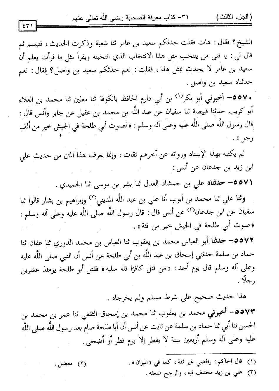 5571 - حَدَّثَنَاهُ عَلِيُّ بْنُ حَمْشَاذَ الْعَدْلُ ، ثَنَا بِشْرُ بْنُ مُوسَى ، ثَنَا الْحُمَيْدِيُّ ، وَثَنَا عَلِيٌّ ، ثَنَا مُحَمَّدُ بْنُ أَيُّوبَ ، أَنَا عَلِيُّ بْنُ عَبْدِ اللَّهِ الْمَدِينِيُّ ، وَإِبْرَاهِيمُ بْنُ بَشَّارٍ ، قَالُوا: ثَنَا سُفْيَانُ ، عَنِ ابْنِ جُدْعَانَ ، عَنْ أَنَسٍ قَالَ: قَالَ رَسُولُ اللَّهِ صَلَّى اللَّهُ عَلَيْهِ وَسَلَّمَ: " صَوْتٌ أَبِي طَلْحَةَ فِي الْجَيْشِ خَيْرٌ مِنْ فِئَةٍ "