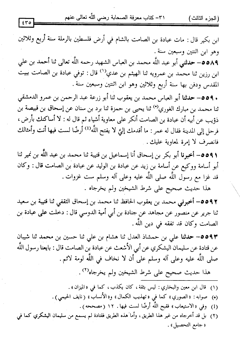 5589 - حَدَّثَنِي أَبُو عَبْدِ اللَّهِ مُحَمَّدُ بْنُ الْعَبَّاسِ الشَّهِيدُ * رَحِمَهُ اللَّهُ تَعَالَى ، ثَنَا أَحْمَدُ بْنُ عَلِيِّ بْنِ رَزِينٍ ، ثَنَا مُحَمَّدُ بْنُ عَمْرَوَيْهِ ، ثَنَا الْهَيْثَمُ بْنُ عَدِيٍّ قَالَ: " تُوُفِّيَ عُبَادَةُ بْنُ الصَّامِتِ بِبَيْتِ الْمَقْدِسِ ، وَدُفِنَ بِهَا سَنَةَ أَرْبَعٍ وَثَلَاثِينَ وَهُوَ ابْنُ اثْنَتَيْنِ وَسَبْعِينَ سَنَةً "