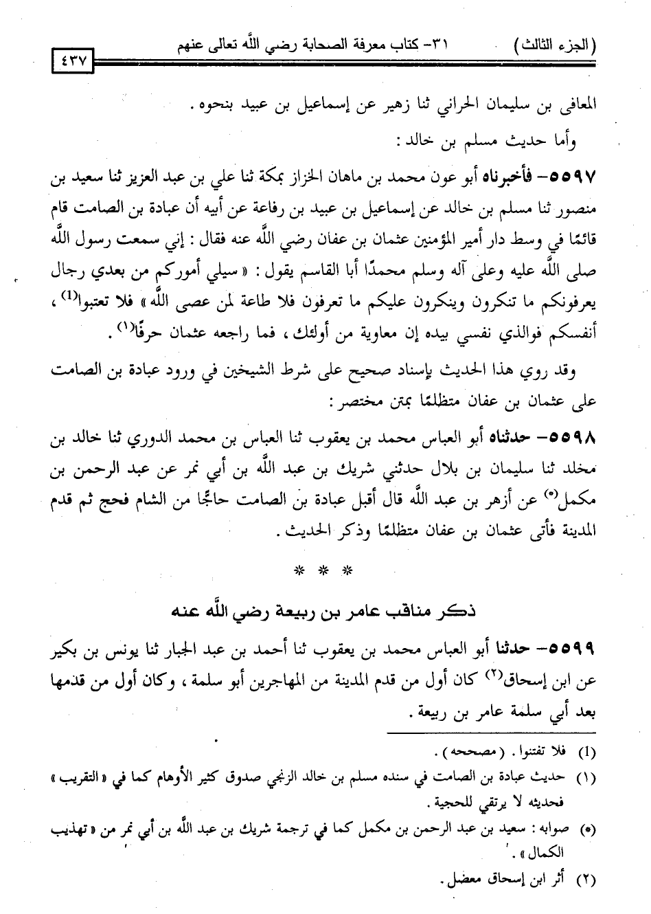 5597 - فَأَخْبَرَنَاهُ أَبُو عَوْنٍ مُحَمَّدُ بْنُ مَاهَانَ الْخَزَّازُ ، بِمَكَّةَ ، ثَنَا عَلِيُّ بْنُ عَبْدِ الْعَزِيزِ ، ثَنَا سَعِيدُ بْنُ مَنْصُورٍ ، ثَنَا مُسْلِمُ بْنُ خَالِدٍ ، عَنْ إِسْمَاعِيلَ بْنِ عُبَيْدِ بْنِ رِفَاعَةَ ، عَنْ أَبِيهِ ، أَنَّ عُبَادَةَ بْنَ الصَّامِتِ ، قَامَ قَائِمًا فِي وَسَطِ دَارِ أَمِيرِ الْمُؤْمِنِينَ عُثْمَانَ بْنِ عَفَّانَ رَضِيَ اللَّهُ عَنْهُ فَقَالَ: إِنِّي سَمِعْتُ رَسُولَ اللَّهِ صَلَّى اللَّهُ عَلَيْهِ وَسَلَّمَ مُحَمَّدًا أَبَا الْقَاسِمِ يَقُولُ: " سَيَلِي أُمُورَكُمْ مِنْ بَعْدِي رِجَالٌ يُعَرِّفُونَكُمْ مَا تُنْكِرُونَ ، وَيُنْكِرُونَ عَلَيْكُمْ مَا تَعْرِفُونَ ، فَلَا طَاعَةَ لِمَنْ عَصَى اللَّهَ ، فَلَا تَعْتُبُوا أَنْفُسَكُمْ ، فَوَالَّذِي نَفْسِي بِيَدِهِ ، إِنَّ مُعَاوِيَةَ مِنْ أُولَئِكَ " ، فَمَا رَاجَعَهُ عُثْمَانُ حَرْفًا