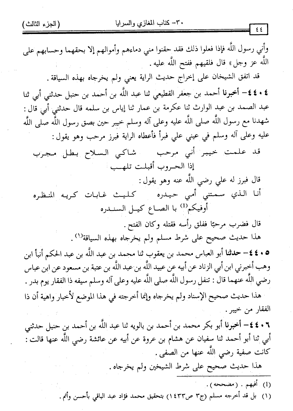 4404 - أَخْبَرَنَا أَحْمَدُ بْنُ جَعْفَرٍ الْقَطِيعِيُّ ، ثنا عَبْدُ اللَّهِ بْنُ أَحْمَدَ بْنِ حَنْبَلٍ ، حَدَّثَنِي أَبِي ، ثنا عَبْدُ الصَّمَدِ بْنُ عَبْدِ الْوَارِثِ ، ثنا عِكْرِمَةُ بْنُ عَمَّارٍ ، ثنا إِيَاسُ بْنُ سَلَمَةَ ، قَالَ: حَدَّثَنِي أَبِي قَالَ: " شَهِدْنَا مَعَ رَسُولِ اللَّهِ صَلَّى اللَّهُ عَلَيْهِ وَسَلَّمَ خَيْبَرَ حِينَ