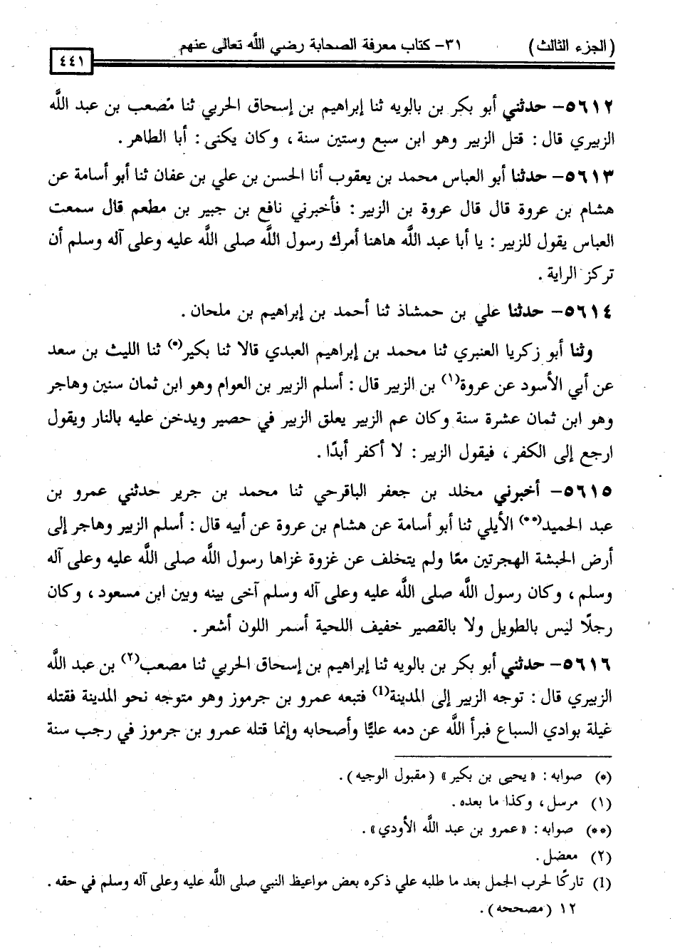 5616 - حَدَّثَنِي أَبُو بَكْرِ بْنُ بَالَوَيْهِ ، ثَنَا إِبْرَاهِيمُ بْنُ إِسْحَاقَ الْحَرْبِيُّ ، ثَنَا مُصْعَبُ بْنُ عَبْدِ اللَّهِ الزُّبَيْرِيُّ ، قَالَ: " تَوَجَّهَ الزُّبَيْرُ إِلَى الْمَدِينَةِ فَتَبِعَهُ عَمْرُو بْنُ جُرْمُوزٍ وَهُوَ مُتَوَجِّهٌ نَحْوَ الْمَدِينَةِ فَقَتَلَهُ غِيلَةً بِوَادِي السِّبَاعِ ، فَبَرَّأَ اللَّهُ عَنْ دَمِهِ عَلِيًّا وَأَصْحَابِهِ ، وَإِنَّمَا قَتَلَهُ عَمْرُو بْنُ جُرْمُوزٍ فِي رَجَبٍ سَنَةَ -[442]- سِتٍّ وَثَلَاثِينَ ، وَبَنُو مُجَاشِعٍ قَدْ سَيَّرَهُمُ الْعَرَبُ بِإِخْفَاءِ الزُّبَيْرِ وَلِذَلِكَ يَقُولُ جَرِيرٌ: