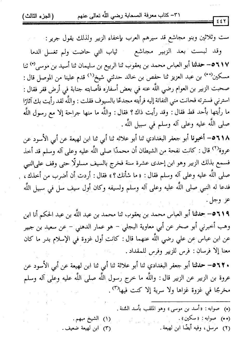 5617 - حَدَّثَنَا أَبُو الْعَبَّاسِ مُحَمَّدُ بْنُ يَعْقُوبَ ، ثَنَا الرَّبِيعُ بْنُ سُلَيْمَانَ ، ثَنَا أَسَدُ بْنُ مُوسَى ، ثَنَا سُكَيْنُ بْنُ عَبْدِ الْعَزِيزِ ، ثَنَا حَفْصُ بْنُ خَالِدٍ ، حَدَّثَنِي شَيْخٌ ، قَدِمَ عَلَيْنَا مِنَ الْمَوْصِلِ ، قَالَ: صَحِبْتُ الزُّبَيْرَ بْنَ الْعَوَّامِ رَضِيَ اللَّهُ عَنْهُ فِي بَعْضِ أَسْفَارِهِ ، فَأَصَابَتْهُ جَنَابَةٌ فِي أَرْضٍ قَفْرٍ ، فَقَالَ: " اسْتُرْنِي " فَسَتَرْتُهُ ، فَحَانَتْ مِنِّي الْتِفَاتَةٌ إِلَيْهِ ، فَرَأَيْتُهُ مُجَدَّعًا بِالسُّيُوفِ ، فَقُلْتُ: وَاللَّهِ لَقَدْ رَأَيْتُ بِكَ آثَارًا مَا رَأَيْتُهَا بِأَحَدٍ قَطُّ ، فَقَالَ: " وَقَدْ رَأَيْتَ ذَاكَ ؟ " ، فَقَالَ: " وَاللَّهِ مَا مِنْهَا جِرَاحَةٌ إِلَّا مَعَ رَسُولِ اللَّهِ صَلَّى اللَّهُ عَلَيْهِ وَسَلَّمَ فِي سَبِيلِ اللَّهِ "