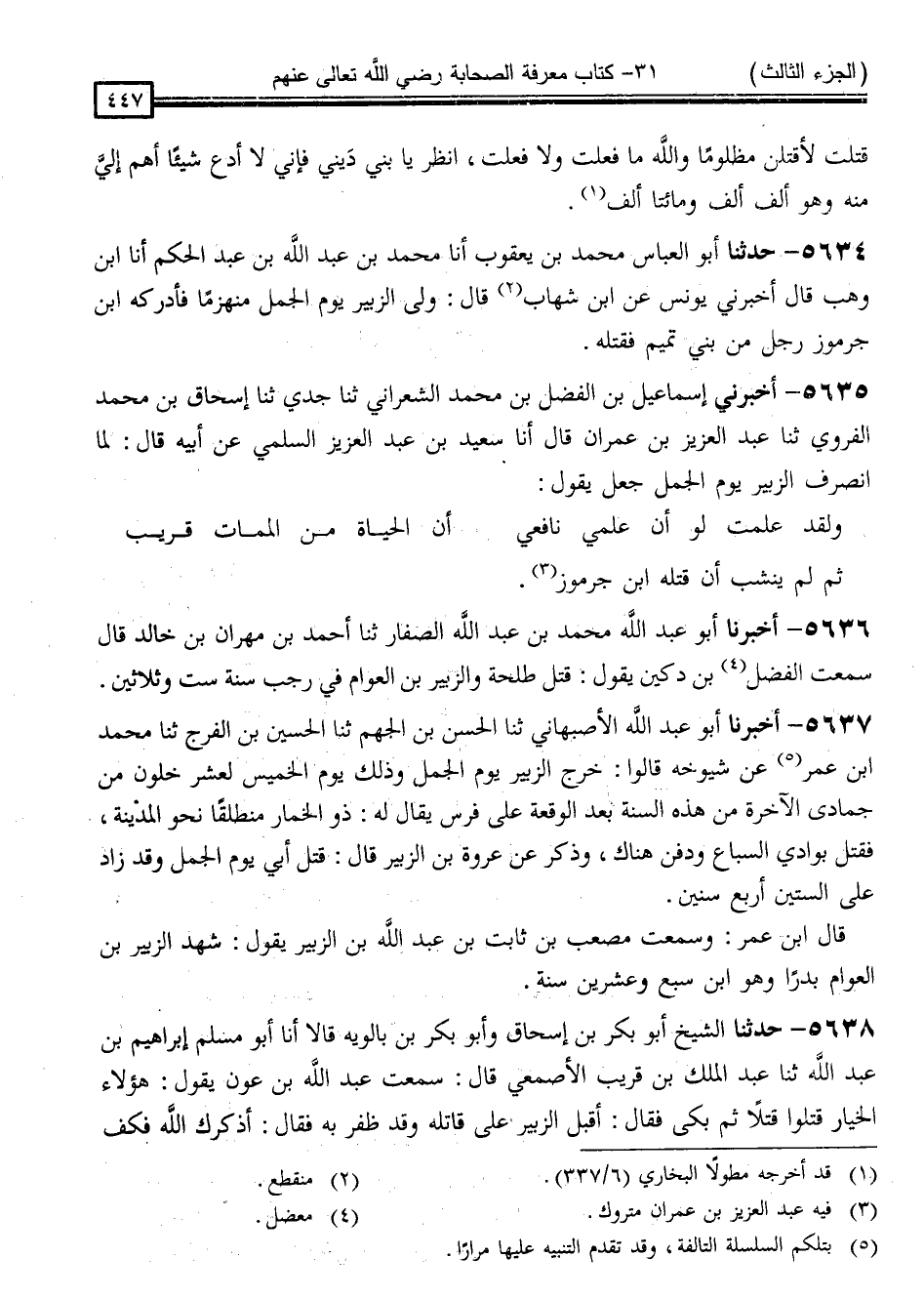 5635 - أَخْبَرَنِي إِسْمَاعِيلُ بْنُ الْفَضْلِ بْنِ مُحَمَّدٍ الشَّعْرَانِيُّ ، ثَنَا جَدِّي ، ثَنَا إِسْحَاقُ بْنُ مُحَمَّدٍ الْفَرْوِيُّ ، ثَنَا عَبْدُ الْعَزِيزِ بْنُ عِمْرَانَ ، قَالَ: أَنَا سَعِيدُ بْنُ عَبْدِ الْعَزِيزِ السُّلَمِيُّ ، عَنْ أَبِيهِ ، قَالَ: لَمَّا انْصَرَفَ الزُّبَيْرُ يَوْمَ الْجَمَلِ جَعَلَ يَقُولُ: "