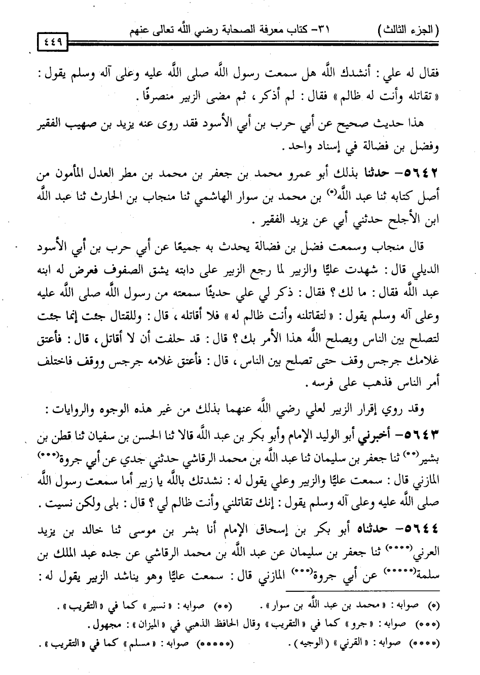 5643 - أَخْبَرَنِي أَبُو الْوَلِيدِ الْإِمَامُ ، وَأَبُو بَكْرِ بْنُ عَبْدِ اللَّهِ ، قَالَا: ثَنَا الْحَسَنُ بْنُ سُفْيَانَ ، ثَنَا قَطَنُ بْنُ بَشِيرٍ * ، ثَنَا جَعْفَرُ بْنُ سُلَيْمَانَ ، ثَنَا عَبْدُ اللَّهِ بْنُ مُحَمَّدٍ الرَّقَاشِيُّ ، حَدَّثَنِي جَدِّي ، عَنْ أَبِي جَرْوَةَ الْمَازِنِيِّ قَالَ: سَمِعْتُ عَلِيًّا ، وَالزُّبَيْرَ ، وَعَلِيٌّ يَقُولُ لَهُ: أَنْشَدْتُكَ بِاللَّهِ يَا زُبَيْرُ ، أَمَا سَمِعْتَ رَسُولَ اللَّهِ صَلَّى اللَّهُ عَلَيْهِ وَسَلَّمَ يَقُولُ: " إِنَّكَ تُقَاتِلُنِي وَأَنْتَ ظَالِمٌ لِي " ؟ قَالَ: بَلَى ، وَلَكِنِّي نَسِيتُ
