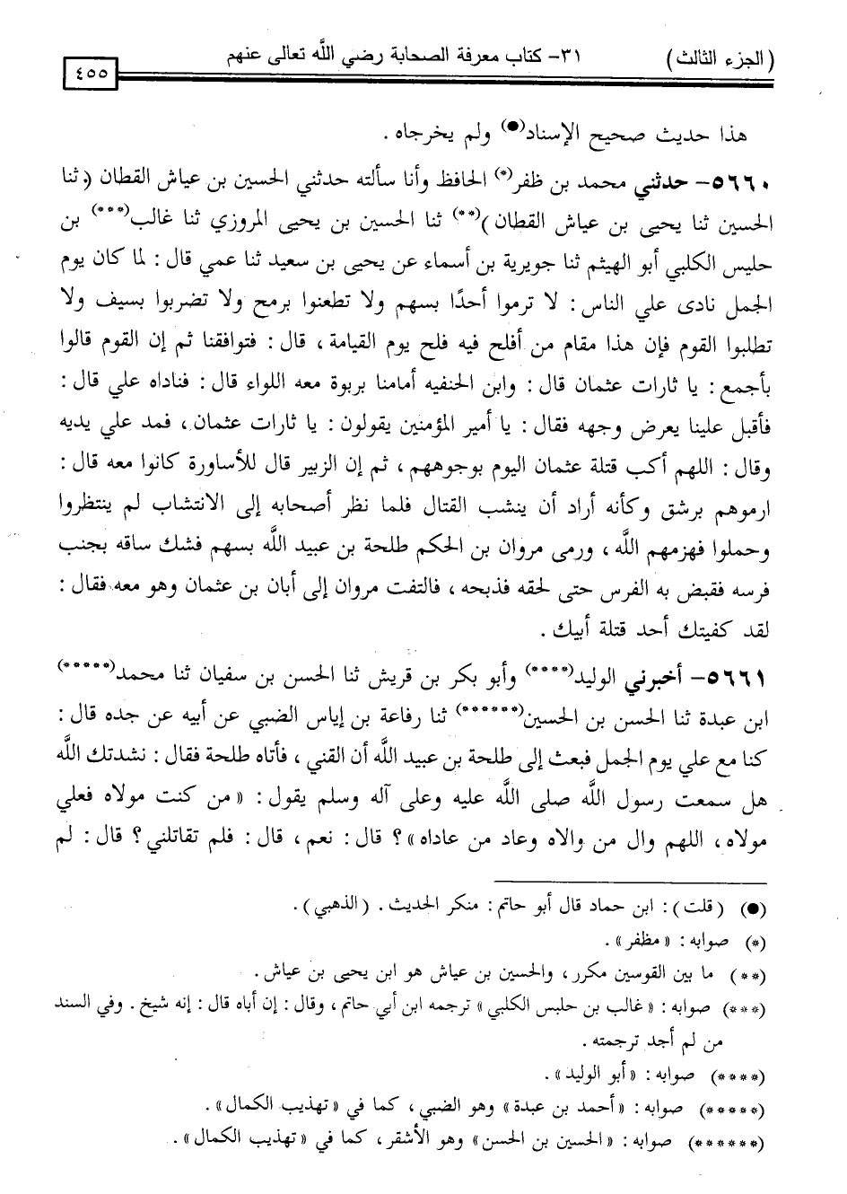 5660 - حَدَّثَنِي مُحَمَّدُ بْنُ ظَفَرٍ * الْحَافِظُ ، وَأَنَا سَأَلْتُهُ ، حَدَّثَنِي الْحُسَيْنُ بْنُ (عَيَّاشٍ الْقَطَّانُ ، ثَنَا الْحُسَيْنُ ، ثَنَا) يَحْيَى بْنُ عَيَّاشٍ الْقَطَّانُ ، ثَنَا الْحُسَيْنُ بْنُ يَحْيَى ** الْمَرْوَزِيُّ *** ، ثَنَا غَالِبُ بْنُ حُلَيْسٍ **** الْكَلْبِيُّ أَبُو الْهَيْثَمِ ، ثَنَا جُوَيْرِيَةُ بْنُ أَسْمَاءَ ، عَنْ يَحْيَى بْنِ سَعِيدٍ ، ثَنَا عَمِّي ، قَالَ: لَمَّا كَانَ يَوْمُ الْجَمَلِ نَادَى عَلِيٌّ فِي النَّاسِ: " لَا تَرْمُوا أَحَدًا بِسَهْمٍ ، وَلَا تَطْعَنُوا بِرُمْحٍ ، وَلَا تَضْرِبُوا بِسَيْفٍ ، وَلَا تَطْلُبُوا الْقَوْمَ ، فَإِنَّ هَذَا مَقَامُ مَنْ أَفْلَحَ فِيهِ ، فَلَحَ يَوْمَ الْقِيَامَةِ " ، قَالَ: فَتَوَافَقْنَا ، ثُمَّ إِنَّ الْقَوْمَ قَالُوا بِأَجْمَعَ: يَا ثَارَاتِ عُثْمَانَ ، قَالَ: وَابْنُ الْحَنَفِيَّةِ إِمَامُنَا بِرَبْوَةٍ مَعَهُ اللِّوَاءُ ، قَالَ: فَنَادَاهُ عَلِيٌّ قَالَ: فَأَقْبَلَ عَلَيْنَا يَعْرِضُ وَجْهَهُ ، فَقَالَ: يَا أَمِيرَ الْمُؤْمِنِينَ ، يَقُولُونَ: يَا ثَارَاتِ عُثْمَانَ ، فَمَدَّ عَلِيٌّ يَدَيْهِ ، وَقَالَ: " اللَّهُمَّ أَكِبَّ قَتَلَةَ عُثْمَانَ الْيَوْمَ بِوُجُوهِهِمْ " ، ثُمَّ إِنَّ الزُّبَيْرَ ، قَالَ لِلْأَسَاوِرَةِ كَانُوا مَعَهُ قَالَ: ارْمُوهُمْ بِرِشْقٍ ، وَكَأَنَّهُ أَرَادَ أَنْ يَنْشَبَ الْقِتَالُ ، فَلَمَّا نَظَرَ أَصْحَابُهُ إِلَى الِانْتِشَابِ لَمْ يَنْتَظِرُوا وَحَمَلُوا فَهَزَمَهُمُ اللَّهُ ، وَرَمَى مَرْوَانُ بْنُ الْحَكَمِ طَلْحَةَ بْنَ عُبَيْدِ اللَّهِ بِسَهْمٍ فَشَكَّ سَاقَهُ بِجَنْبِ فَرَسِهِ ، فَقَبَضَ بِهِ الْفَرَسَ حَتَّى لَحِقَهُ فَذَبَحَهُ فَالْتَفَتَ مَرْوَانُ إِلَى أَبَانَ بْنِ عُثْمَانَ وَهُوَ مَعَهُ ، فَقَالَ: لَقَدْ كَفَيْتُكَ أَحَدَ قَتَلَةِ أَبِيكَ