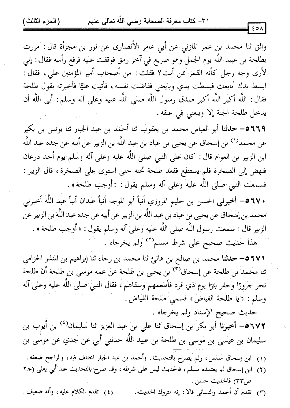 5671 - حَدَّثَنَا مُحَمَّدُ بْنُ صَالِحِ بْنِ هَانِئٍ ، ثَنَا مُحَمَّدُ بْنُ رَجَاءَ ، ثَنَا إِبْرَاهِيمُ بْنُ الْمُنْذِرِ الْحِزَامِيُّ ، ثَنَا مُحَمَّدُ بْنُ طَلْحَةَ ، عَنْ إِسْحَاقَ بْنِ يَحْيَى بْنِ طَلْحَةَ ، عَنْ عَمِّهِ مُوسَى بْنِ طَلْحَةَ ، أَنَّ طَلْحَةَ ، نَحَرَ جَزُورًا وَحَفَرَ بِئْرًا يَوْمَ ذِي قَرَدٍ فَأَطْعَمَهُمْ وَسَقَاهُمْ ، فَقَالَ النَّبِيُّ صَلَّى اللَّهُ عَلَيْهِ وَسَلَّمَ: " يَا طَلْحَةُ الْفَيَّاضُ " فَسُمِّيَ طَلْحَةَ الْفَيَّاضَ حَدِيثٌ صَحِيحُ الْإِسْنَادِ ، وَلَمْ يُخَرِّجَاهُ